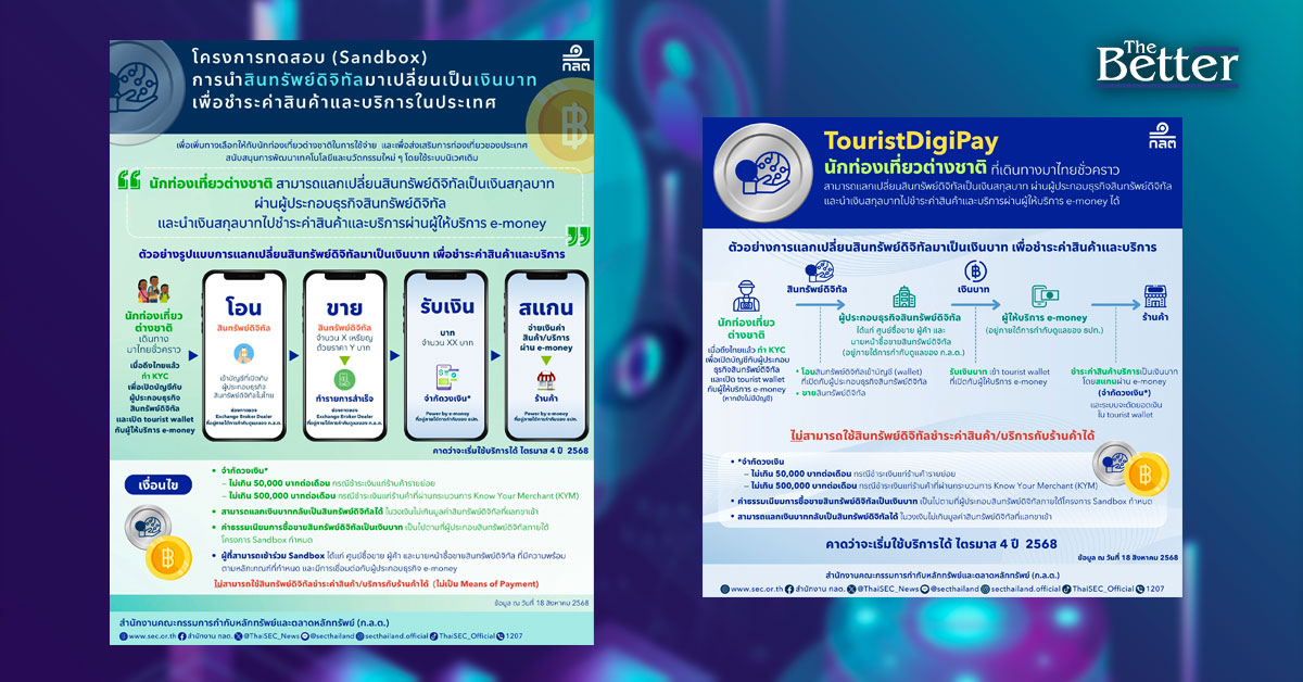 เมื่อวันที่ 18 สิงหาคม 2568 สำนักงานคณะกรรมการกำกับหลักทรัพย์และตลาดหลักทรัพย์ (ก.ล.ต.) ร่วมกับกระทรวงการคลัง สำนักงานป้องกันและปราบปรามการฟอกเงิน (ปปง.) และกระทรวงการท่องเที่ยวและกีฬา เปิดตัว “TouristDigiPay” โครงการทดสอบ (Sandbox) ในการนำสินทรัพย์ดิจิทัลมาเปลี่ยนเป็นเงินบาทและนำไปใช้จ่ายผ่าน e-money เพิ่มทางเลือกนักท่องเที่ยวต่างชาติ ส่งเสริมการนำนวัตกรรมและสินทรัพย์ดิจิทัลมาสนับสนุนเศรษฐกิจและอุตสาหกรรมท่องเที่ยวของประเทศ