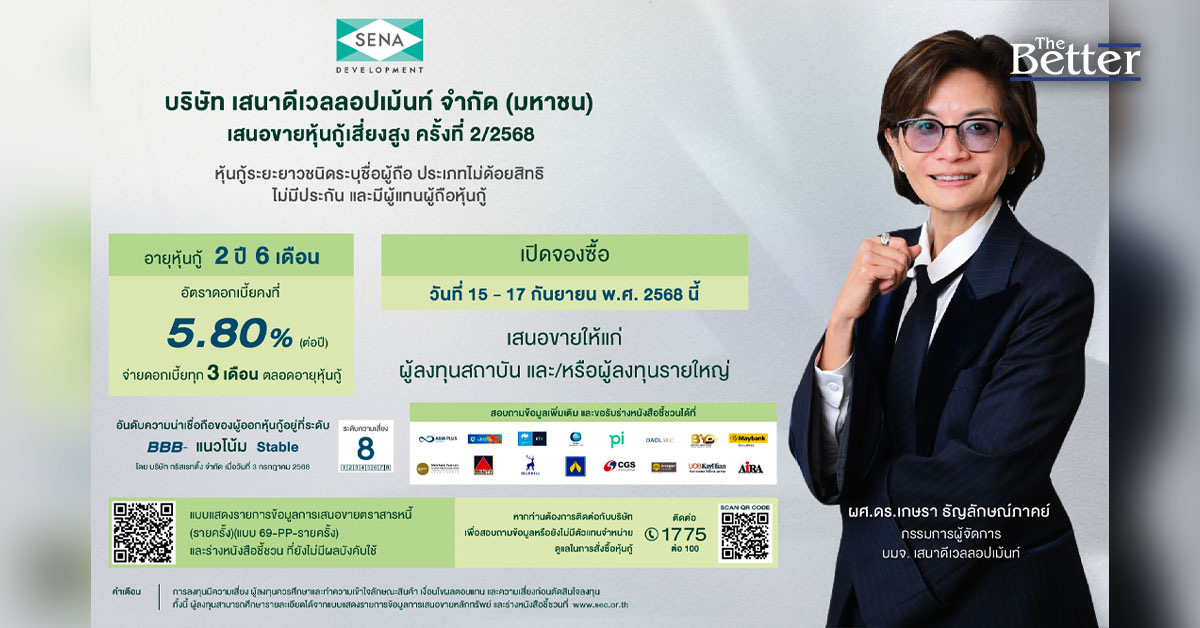 SENA ออกหุ้นกู้ชุดใหม่ อายุ 2 ปี 6 เดือน อัตราดอกเบี้ยคงที่ 5.80% ต่อปี จ่ายดอกเบี้ยทุก ๆ 3 เดือน เสนอขายให้แก่ผู้ลงทุนสถาบัน และ/หรือ ผู้ลงทุนรายใหญ่ เปิดจองซื้อระหว่างวันที่ 15–17 กันยายน 2568 นี้!!