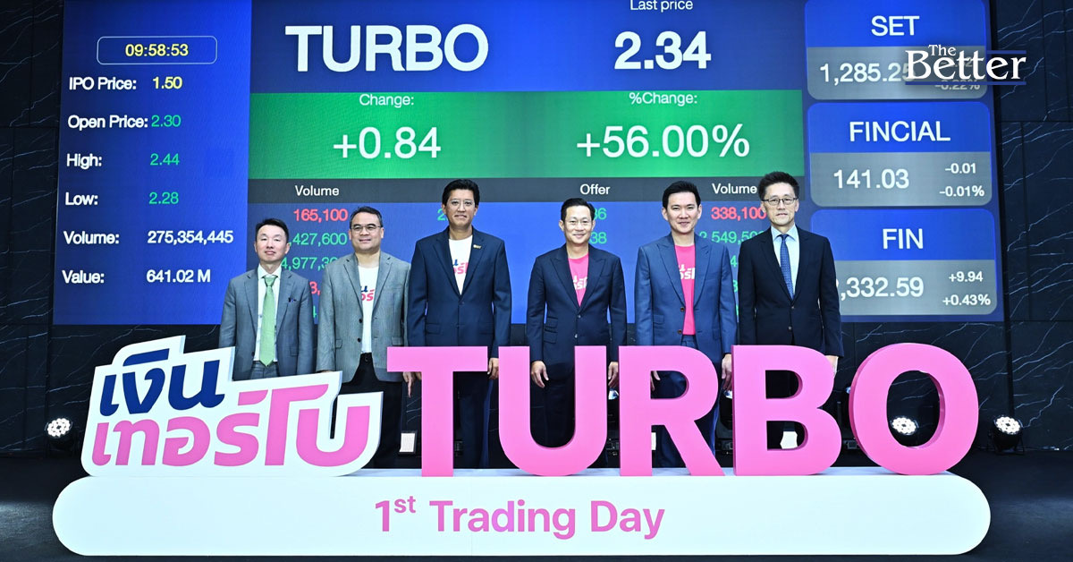 TURBO เปิดเทรดวันแรกด้วยราคาเหนือจองที่ 2.30 บาท เพิ่มขึ้น 0.8 บาท คิดเป็น 53.33% จากราคา IPO ที่ 1.50 บาท พร้อมเดินหน้าขยายสาขาไม่น้อยกว่า 1,457 แห่งทั่วประเทศภายในปี 2572 ควบคู่กับการพัฒนาผลิตภัณฑ์ทางการเงินและบริการใหม่ๆ ดันพอร์ตสินเชื่อรวมเติบโตต่อเนื่อง