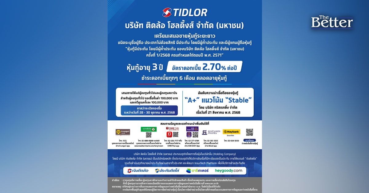 TIDLOR เคาะดอกเบี้ยหุ้นกู้อายุ 3 ปี อัตราดอกเบี้ยคงที่ 2.70% ชูเรทติ้ง "A+" เสนอขายหุ้นกู้ต่อผู้ลงทุนทั่วไปและผู้ลงทุนสถาบัน คาดเปิดจองซื้อระหว่างวันที่ 28-30 ต.ค. นี้