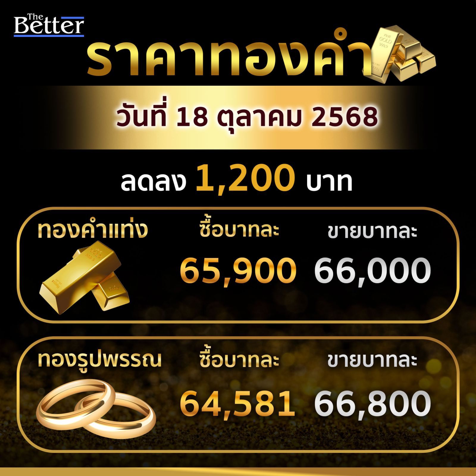สมาคมค้าทองคำ รายงาน ราคาทองคำประจำวันที่ 18 ตุลาคม 2568 เปิดตลาดร่วงแรง 1,200 บาท ราคาทองคำแท่งรับซื้อบาทละ 65,900 ขายออกบาทละ 66,000 ทองรูปพรรณรับซื้อบาทละ 64,581.60 ขายออกบาท 66,800 บาท