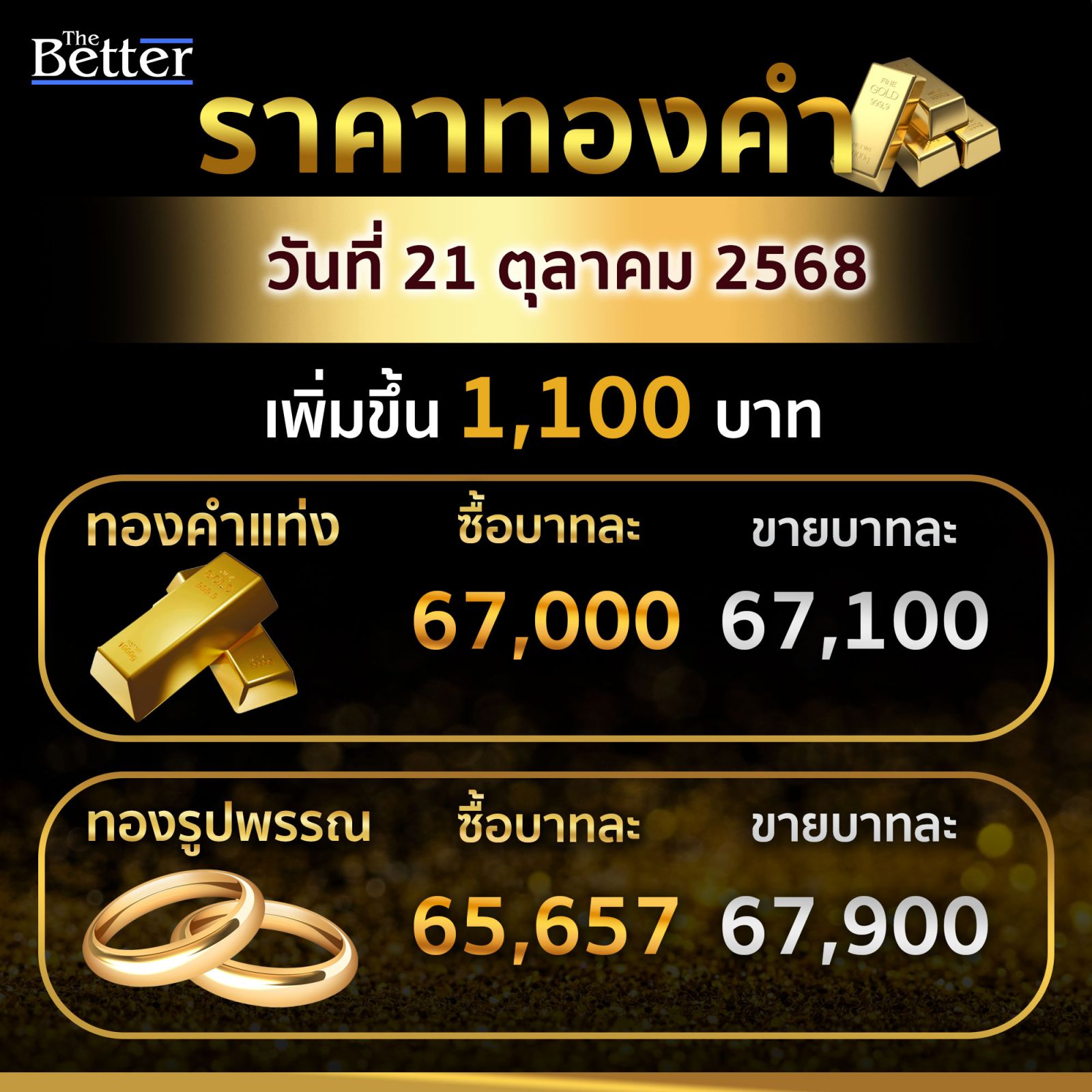 สมาคมค้าทองคำ เผย ราคาทองวันนี้ 21 ต.ค.68 เปิดตลาด ขึ้น 1,100 บาท ทองแท่ง 67,100.00 รูปพรรณ 67,900.00 บาท