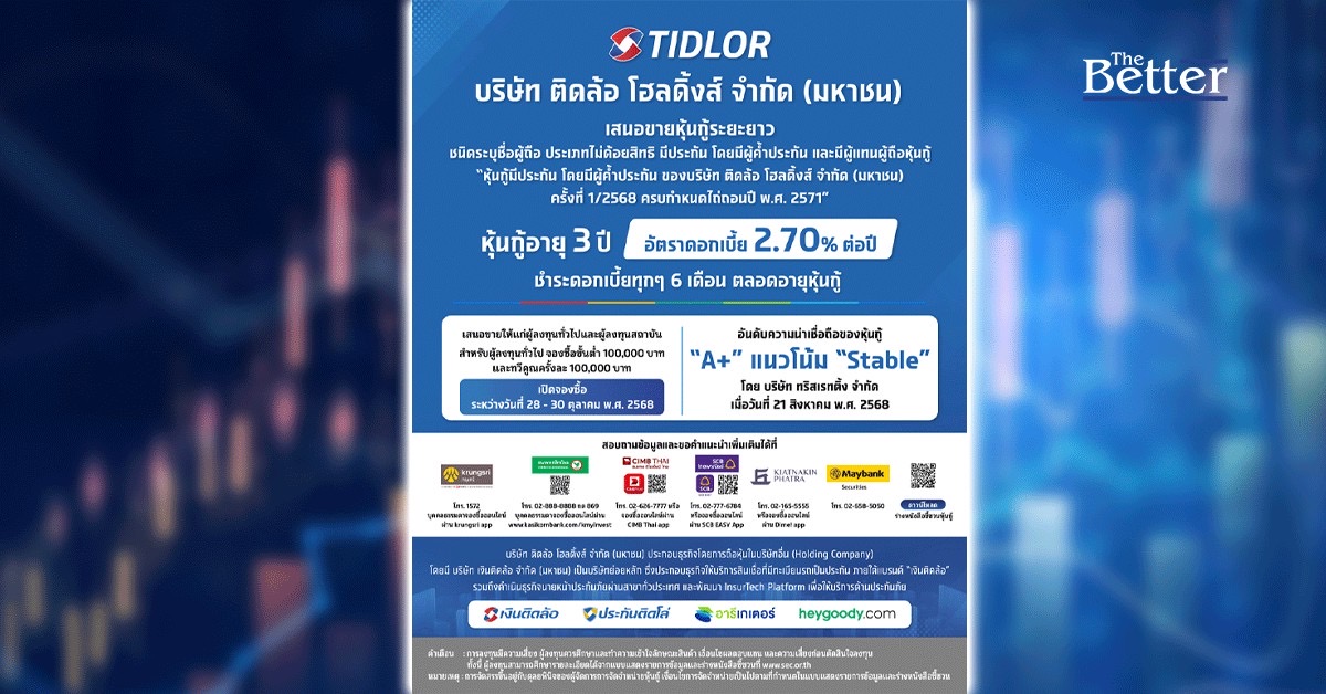 คึกคักรับปลายปี! บมจ. ติดล้อ โฮลดิ้งส์(“TIDLOR”) เปิดขายหุ้นกู้ อายุ 3 ปี อัตราดอกเบี้ย 2.70% ต่อปี จ่ายดอกเบี้ยทุก ๆ 6 เดือนตลอดอายุหุ้นกู้ งานนี้เปิดกว้างให้นักลงทุนทั้งรายใหญ่และรายย่อยร่วมจองซื้อได้ทั่วประเทศ ลงทุนเริ่มต้นเพียง 100,000 บาท และทวีคูณครั้งละ100,000 บาท เปิดจองซื้อระหว่างวันที่ 28–30ตุลาคม 2568 (3 วันเท่านั้น!) ผ่านช่องทางจองซื้อสุดสะดวกทั้ง 6 ราย ได้แก่