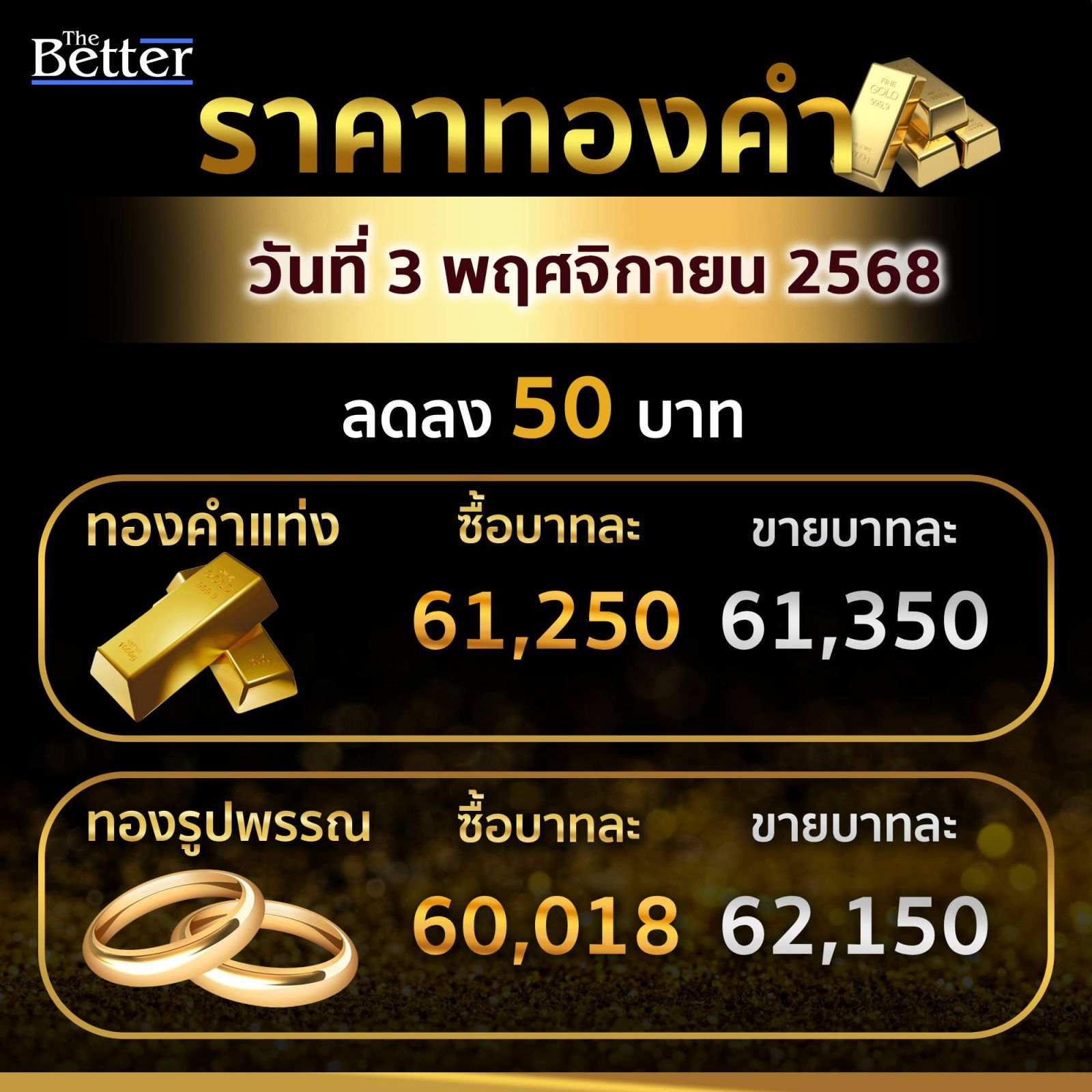 สมาคมค้าทองคำ เผย ราคาทองวันนี้ 3 พ.ย.68 เปิดตลาดลดลง 50 บาท ทองแท่ง 61,350 รูปพรรณ 62,150บาท