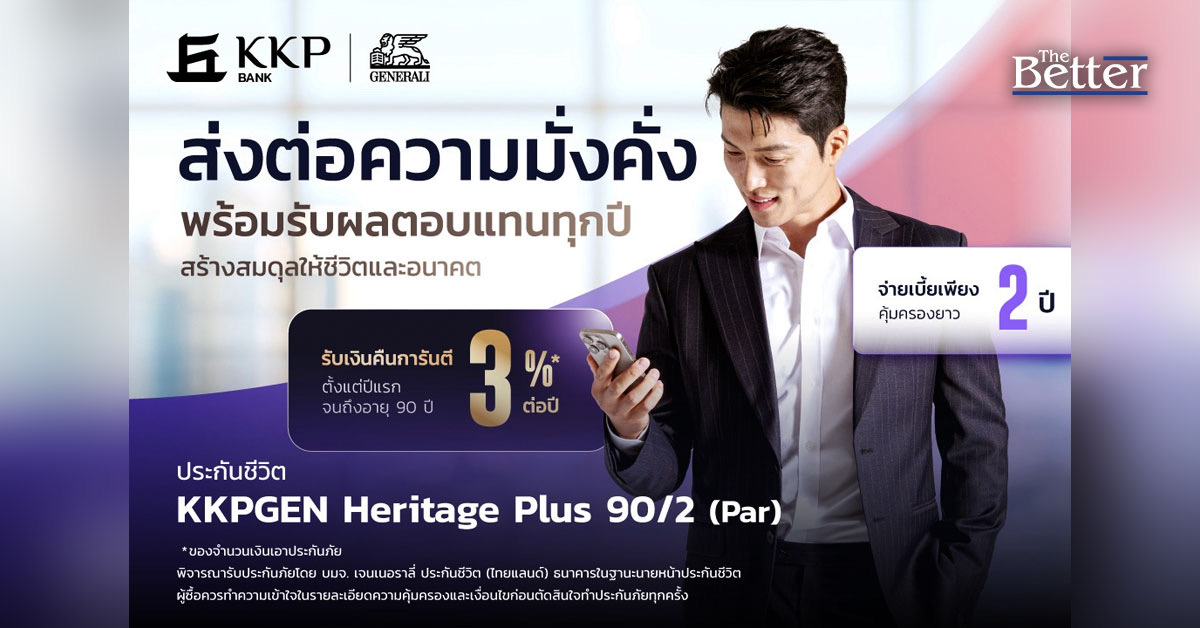 ธนาคารเกียรตินาคินภัทร ผนึกกำลัง เจนเนอราลี่ ประกันชีวิต (ไทยแลนด์) เปิดตัวผลิตภัณฑ์ใหม่ “KKPGEN Heritage Plus 90/2 (Par)” ประกันชีวิตที่ช่วยยกระดับการบริหารความมั่งคั่ง ด้วยการ “พลัส” อิสระทางการเงิน สร้างสมดุลให้ชีวิตและมรดก ชูจุดเด่นจ่ายเบี้ยสั้นเพียง 2 ปี รับความคุ้มครองสูงสุด 300% ของจำนวนเงินเอาประกันภัยควบคู่ผลตอบแทนระยะยาวเป็นเงินคืนการันตี 3% ของจำนวนเงินเอาประกันภัยต่อเนื่องทุกปีตั้งแต่ปีแรกจนถึงอายุ 90 ปี พร้อมโอกาสรับเงินปันผลรายปีเพื่อช่วยให้ลูกค้าสามารถวางแผนชีวิตและแผนมรดกได้อย่างยืดหยุ่น ใช้ชีวิตอย่างมั่นใจในวันนี้ และส่งต่อความมั่งคั่งให้คนที่รักได้อย่างมั่นคง