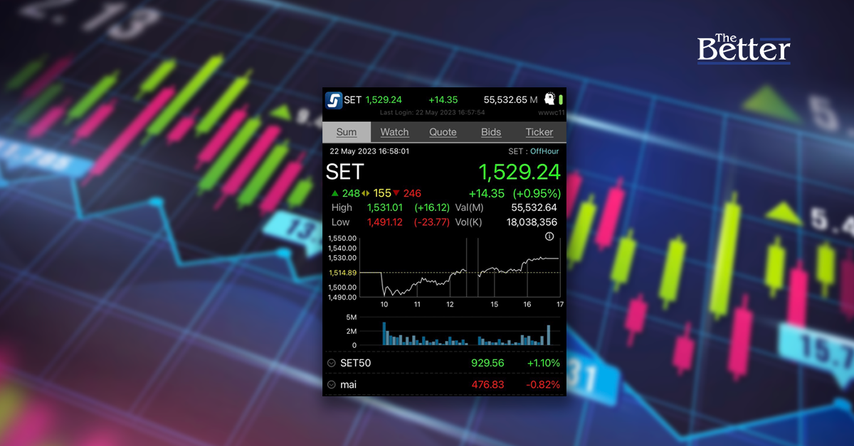 ตลาดหุ้นไทยวันนี้ ปิดที่ 1,529.24 จุด เพิ่มขึ้น 14.35 จุด คิดเป็น 0.95% โดยดัชนีฯ รีบาวน์หลังจากช่วงเช้าร่วงไปกว่า 20 จุด เนื่องจากตลาดค่อนข้างผันผวนตามทิศทางสถานการณ์การเมืองในประเทศ