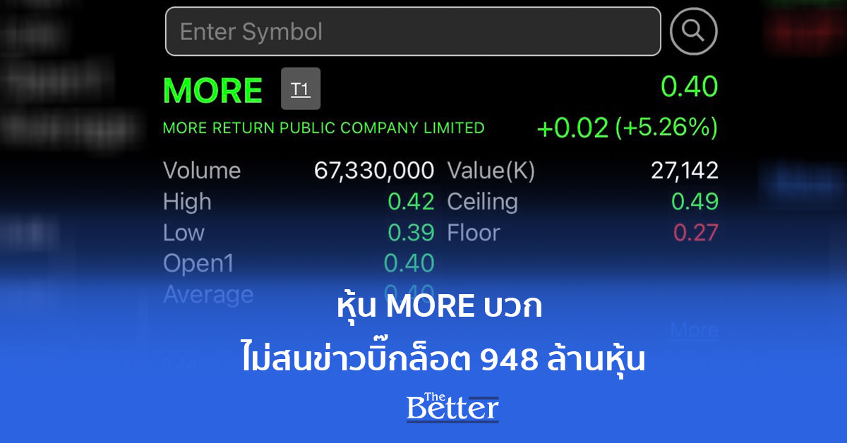 กนกวรรณ บุญประกอบ เลขานุการ บริษัท มอร์ รีเทิร์น จํากัด (มหาชน) หรือ MORE เปิดเผยว่า บริษัทฯ ขอเรียนให้ทราบว่าตามที่ได้มีการทํารายการซื้อ ขายหุ้นผ่านระบบ การซื้อขายของตลาดหลักทรัพย์บนกระดานรายใหญ่ (Big Lot Board) ประจําวันท่ี 27 มกราคม 2566 จํานวน 948,108,300 หุ้น หรือคิดเป็นร้อยละ 13.21 ของทุนจดทะเบียนชําระแล้วของบริษัทฯ นั้น บริษัทฯ ยังไม่ได้รับการติดต่อใดๆ จากผู้ถือหุ้นที่ ทํารายการดังกล่าวและหากบริษัทฯ มีข้อมูลเพิ่มเติมจะรีบดําเนินการแจ้งต่อตลาดหลักทรัพย์ทันที