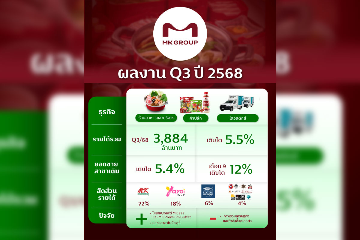 หลังจาก MK ส่งบุฟเฟต์ลุยตลาด ทั้ง “MK คุ้มเกินคุ้ม 299 บาท” และ “MK Premium Buffet” ส่งผลให้ยอดขายรวม ไตรมาส 3 ปี 2568 เติบโตขึ้นอย่างมีนัยสำคัญ โดยมีเทรนด์การเติบโตขึ้นต่อเนื่องในทุกไตรมาสตั้งแต่ต้นปี ซึ่งช่วยเสริมความแข็งแกร่งให้กับภาพรวมของกลุ่มในปีนี้