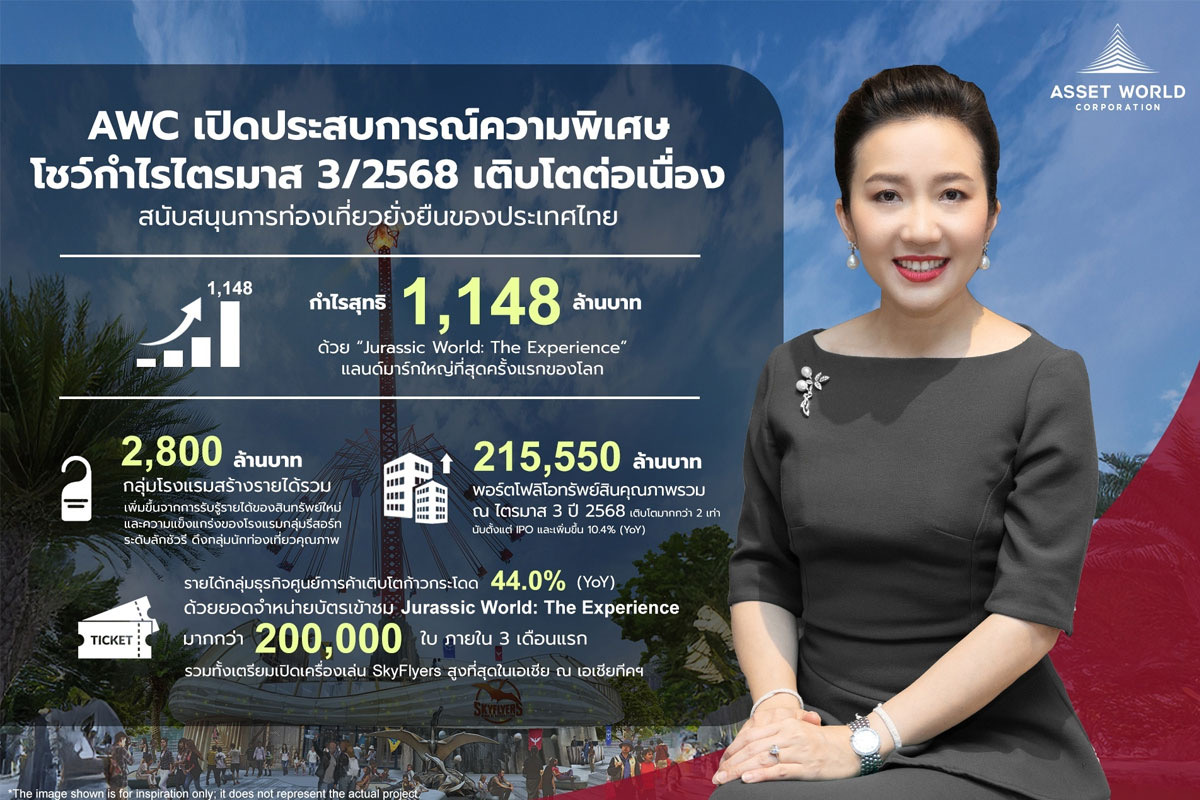 AWC เปิดประสบการณ์ความพิเศษ พร้อมกำไรสุทธิไตรมาส 3/2568 เติบโตต่อเนื่องสู่ 1,148 ล้านบาท ด้วย “Jurassic World: The Experience”แลนด์มาร์กใหญ่ที่สุดครั้งแรก ของโลกที่เอเชียทีค เดอะ ริเวอร์ฟร้อนท์ฯ
