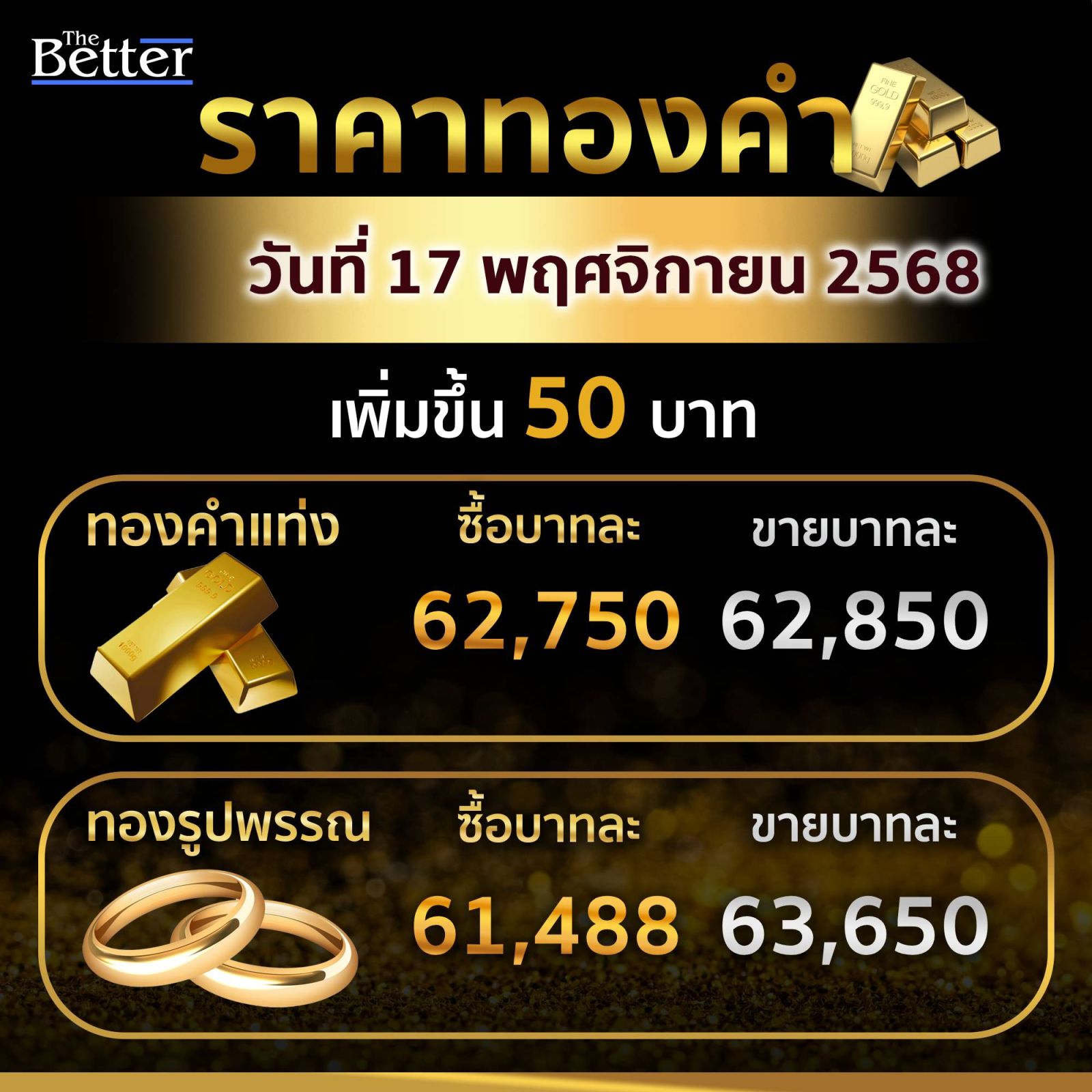 สมาคมค้าทองคำ เผย ราคาทองวันนี้ 17 พ.ย.68 เปิดตลาดเพิ่มขึ้น 50 บาท ทองแท่ง 62,850 รูปพรรณ 63,650 บาท
