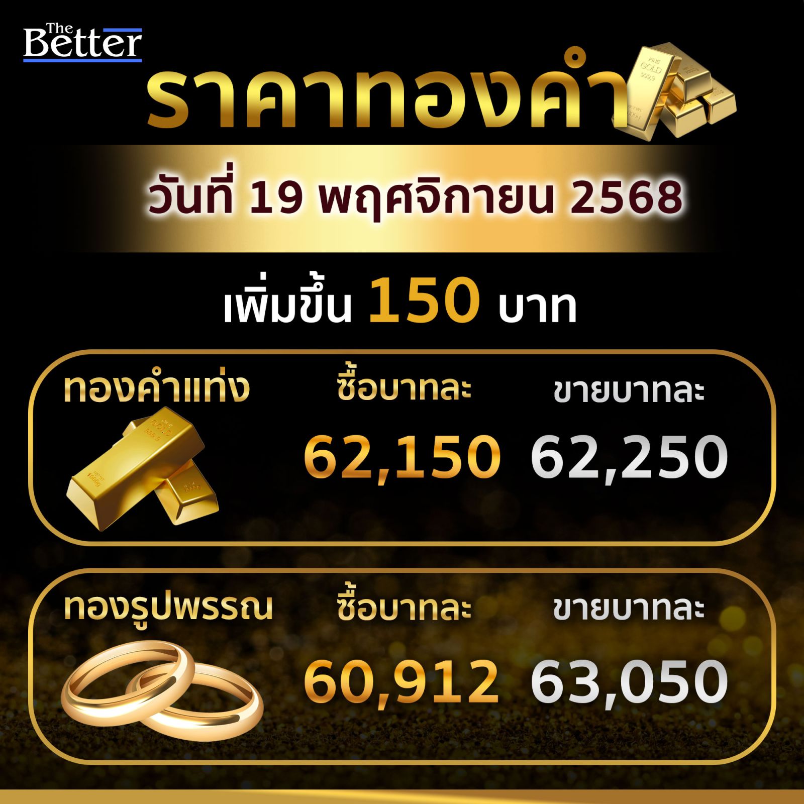 สมาคมค้าทองคำ เผย ราคาทองวันนี้ 19 พ.ย.68 เปิดตลาดขึ้น 150 บาท ทองแท่ง 62,250 รูปพรรณ 63,050 บาท