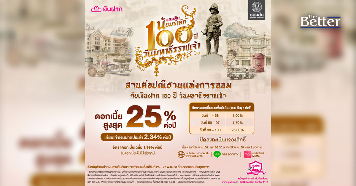 ออมสิน ออกเงินฝากส่งเสริมการออม น้อมรำลึกในพระมหากรุณาธิคุณ รัชกาลที่ 6 “เงินฝาก 100 ปี วันมหาธีรราชเจ้า” ฝาก 100 วัน ดอกเบี้ย Step up สูงสุด 25% ต่อปี จองสิทธิ์ 24 พ.ย. นี้