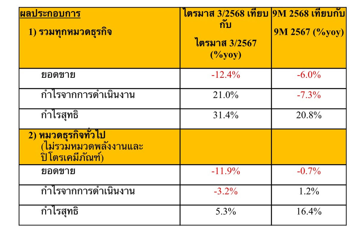 สำหรับงวดไตรมาส 3/2568 เทียบกับไตรมาส 3/2567 บจ.ส่วนใหญ่มียอดขายลดลง แต่มีกำไรจากการดำเนินงานและกำไรสุทธิเพิ่มขึ้น 21.0% และ 31.4% ตามลำดับเนื่องจาก บจ. ในธุรกิจโรงกลั่นน้ำมันมีราคาส่วนต่างค่าการกลั่นต่ำผิดปกติในปีก่อน ทั้งนี้ หากไม่รวม บจ. ในหมวดธุรกิจพลังงานและปิโตรเคมีภัณฑ์ บจ. มียอดขายและมีกำไรจากการดำเนินงานลดลง 11.9% และ 3.2% ตามลำดับ และมีกำไรสุทธิเพิ่มขึ้น 5.3%