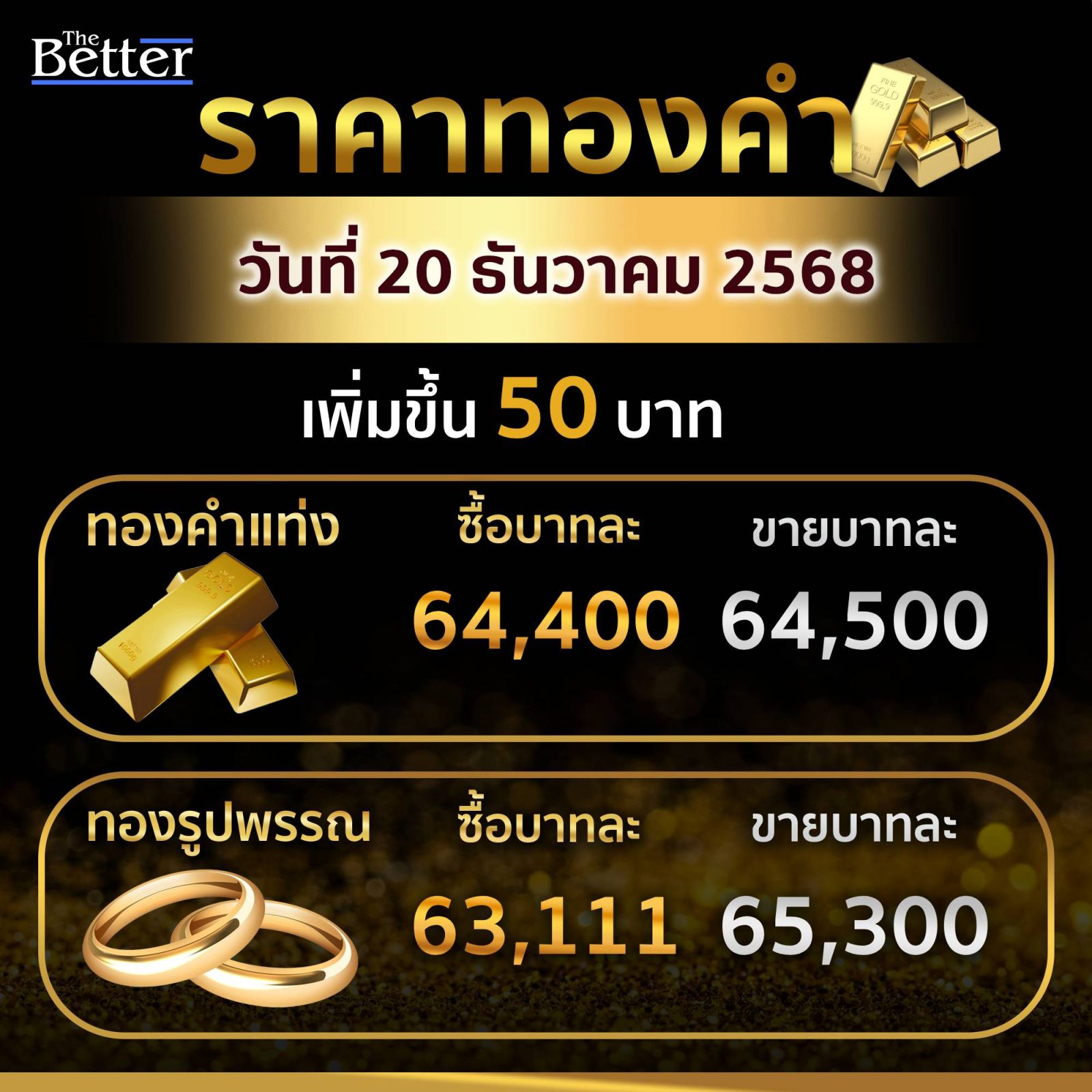สมาคมค้าทองคำ เผย ราคาทองวันนี้ 20 ธ.ค. 68 เปิดตลาดปรับขึ้น 50 บาท ทองแท่ง 64,500 รูปพรรณ 65,300 บาท