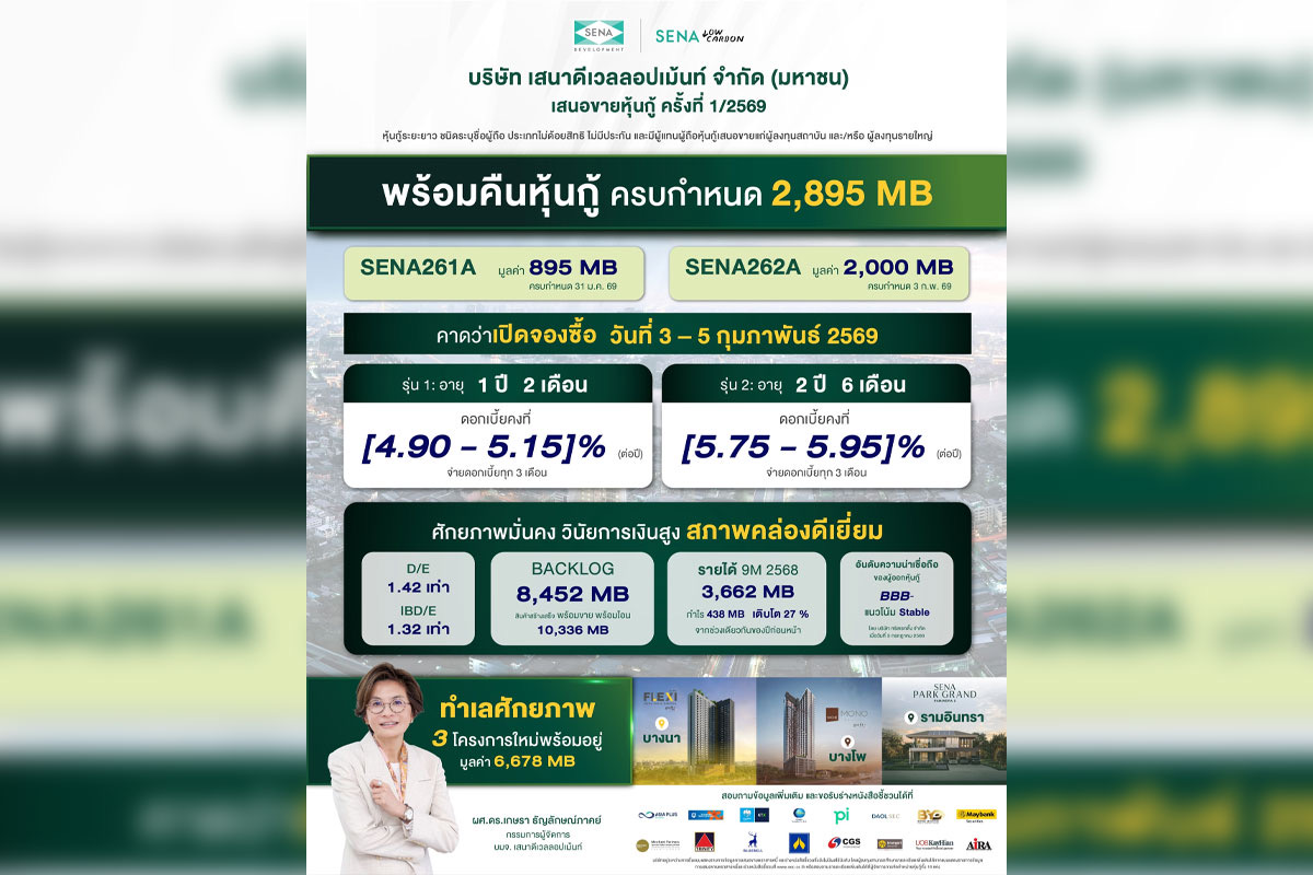 SENA สถานะการเงินแข็งแกร่ง พร้อมชำระคืนหุ้นกู้ครบกำหนด 2.8 พันล้านบาท เตรียมเปิดเสนอขายหุ้นกู้รุ่นใหม่ระหว่างวันที่ 3 – 5 กุมภาพันธ์ 2569