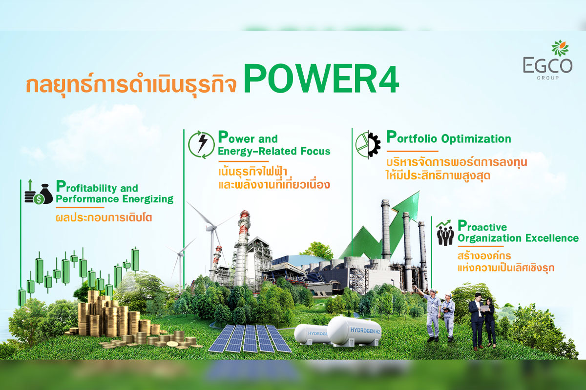 นายธวัชชัย สำราญวานิช กรรมการผู้จัดการใหญ่ บริษัท ผลิตไฟฟ้า จำกัด (มหาชน) หรือ EGCO Group เปิดเผยว่า EGCO Group มุ่งเน้นการสร้างความสมดุลระหว่างผลการดำเนินงานที่แข็งแกร่ง การขยายธุรกิจอย่างต่อเนื่อง และการบรรลุเป้าหมายการเป็นองค์กรคาร์บอนต่ำ ผ่านการดำเนินกลยุทธ์ "POWER4" ซึ่งประกอบด้วยภารกิจ 4 ด้าน ได้แก่