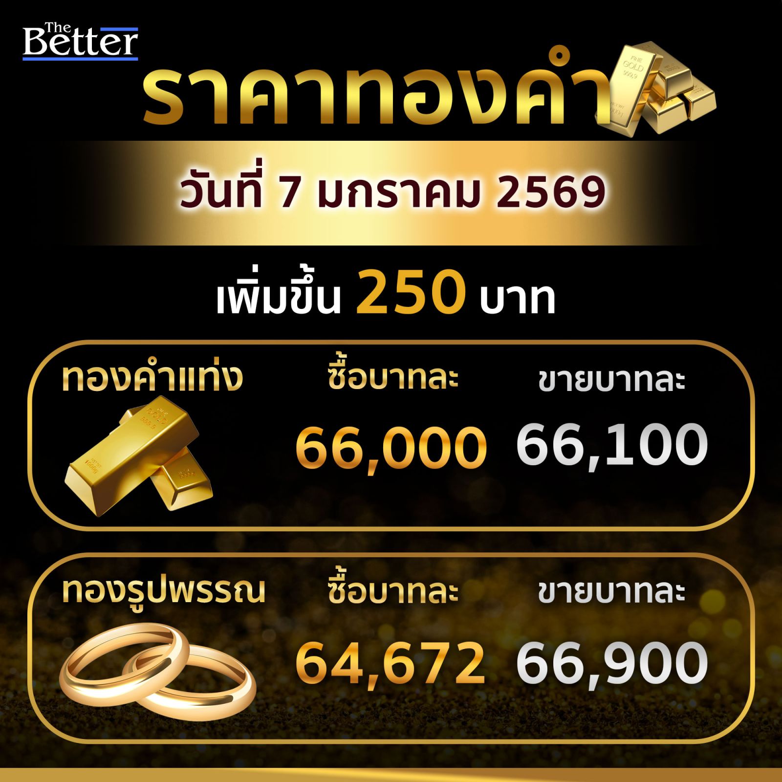 สมาคมค้าทองคำ รายงาน ราคาทองคำประจำวันที่ 7 ม.ค. 2569 เปิดตลาดปรับเพิ่มขึ้น 250 บาท ราคาทองคำแท่งรับซื้อบาทละ 66,000 ขายออกบาทละ 66,100 ทองรูปพรรณรับซื้อบาทละ 64,672.56 ขายออกบาท 66,900 บาท