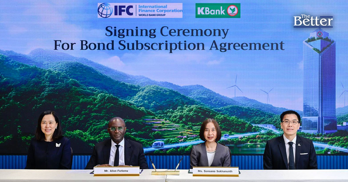 นางสาวศันสนา สุขะนันท์ (ที่ 2 จากขวา) รองผู้จัดการใหญ่ ธนาคารกสิกรไทย ร่วมกับ Mr. Allen Forlemu (ที่ 2 จากซ้าย), International Finance Corporation (IFC) Regional Industry Director, Financial Institutions Group, Asia & Pacific หน่วยงานในกลุ่มธนาคารโลก ลงนามข้อตกลงตราสารหนี้สีเขียว(Green Bond) มูลค่า 100 ล้านดอลลาร์สหรัฐ เพื่อเร่งการลงทุนในโครงการที่เป็นมิตรต่อสิ่งแวดล้อม ด้วยการนำไปสนับสนุนการปล่อยสินเชื่อและการลงทุนสีเขียวของธนาคาร โดยความร่วมมือนี้จะยกระดับการทำธุรกิจให้แก่ลูกค้าในการปรับตัวสู่เทคโนโลยีคาร์บอนต่ำที่มีส่วนในการลดการปล่อยก๊าซเรือนกระจก ซึ่งจะช่วยเพิ่มศักยภาพการแข่งขันให้แก่ธุรกิจบนเวทีโลก และผลักดันให้คนไทยเข้าถึงกรีนไลฟ์สไตล์มากขึ้น เพื่อขับเคลื่อนประเทศไทยเดินหน้าสู่เป้าหมาย Net Zero ซึ่งการลงนามครั้งนี้มี ดร.กรินทร์ บุญเลิศวณิชย์ (ขวา) รองผู้จัดการใหญ่ ธนาคารกสิกรไทย และ Ms. Jane Yuan Xu (ซ้าย), IFC Country Manager, Thailand and Myanmar ร่วมเป็นสักขีพยาน ณ ธนาคารกสิกรไทย สำนักงานใหญ่ พหลโยธิน เมื่อเร็วๆ นี้
