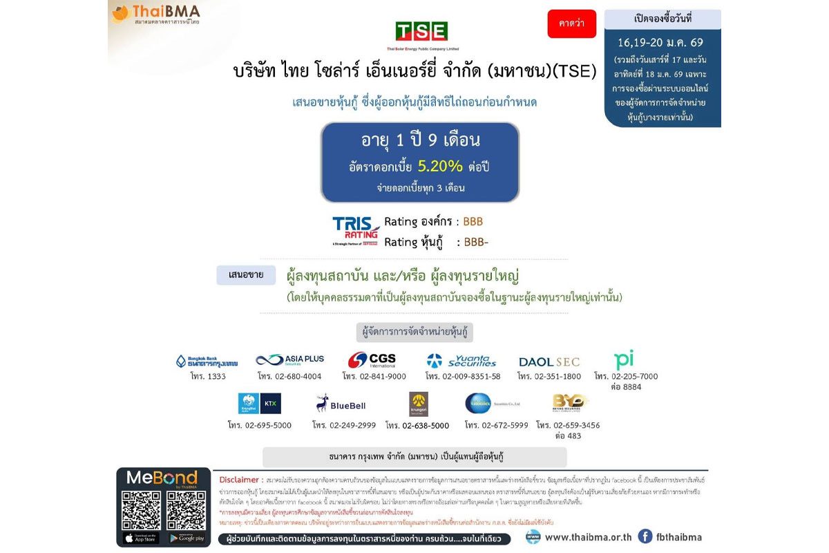 ใครที่กำลังมองหาการลงทุนดอกเบี้ยสม่ำเสมอ เชิญทางนี้จ้า! บริษัท ไทย โซล่าร์ เอ็นเนอร์ยี่ จำกัด (มหาชน) (TSE) เตรียมเสนอขายหุ้นกู้ชุดใหม่ อายุ 1 ปี 9 เดือน อัตราดอกเบี้ย5.20% ต่อปี จ่ายดอกเบี้ยทุก 3 เดือน เปิดให้จองซื้อวันที่ 16, 19 - 20 มกราคมนี้ โดยหุ้นกู้ดังกล่าวเป็นประเภทผู้ออกมีสิทธิไถ่ถอนก่อนครบกำหนด (Callable Bond) และเสนอขายผ่านบริษัทหลักทรัพย์ (บล.) ชั้นนำ 11 แห่ง ด้านซีอีโอของ TSE “ดร.แคทลีน มาลีนนท์” ยืนยันความมั่นใจในการสร้างผลตอบแทนที่มั่นคงให้นักลงทุน โดยชี้ว่าที่ผ่านมา หุ้นกู้ทุกรุ่นของบริษัทจ่ายดอกเบี้ยครบและตรงเวลา พร้อมเผยแผนเตรียมชำระคืนหุ้นกู้ที่จะครบกำหนดในเดือนมกราคมนี้ตามที่วางไว้ขณะเดียวกัน บริษัทยังคงเร่งต่อยอดพัฒนาโครงการพลังงานหมุนเวียนอย่างต่อเนื่อง เพื่อสนับสนุนการเติบโตของธุรกิจในระยะยาวและสร้างผลตอบแทนที่มั่นคงให้ผู้ถือหุ้นกู้...เรียกได้ว่าเป็นอีกหนึ่งทางเลือกลงทุนที่ตอบโจทย์บนพื้นฐานธุรกิจมั่นคง