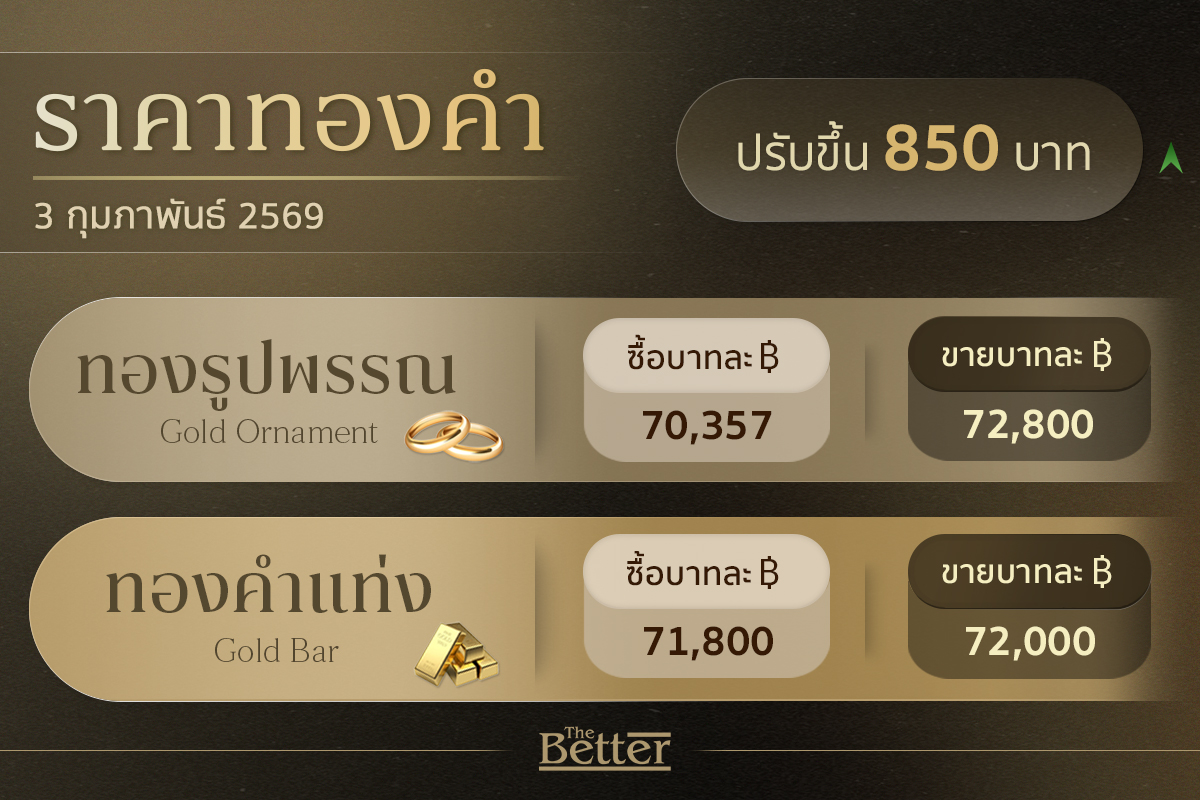 สมาคมค้าทองคำ เผย ราคาทองวันนี้ 3 ก.พ. 69 เปิดตลาดพุ่ง 850 บาท ทองแท่ง 72,000 รูปพรรณ 72,800 บาท