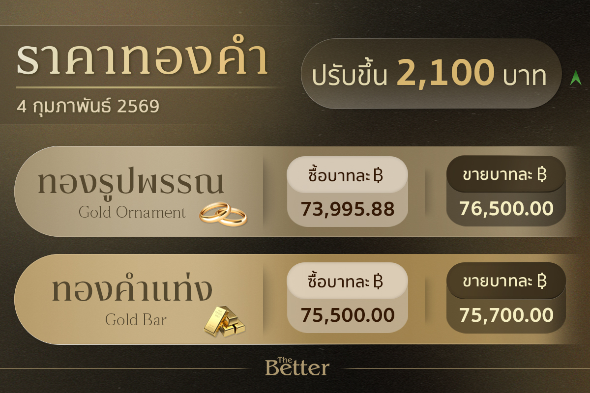 สมาคมค้าทองคำ เผย ราคาทองวันนี้ 4 ก.พ. 69 เปิดตลาดพุ่ง 2,100 บาท ทองแท่ง 75,700 รูปพรรณ 76,500 บาท