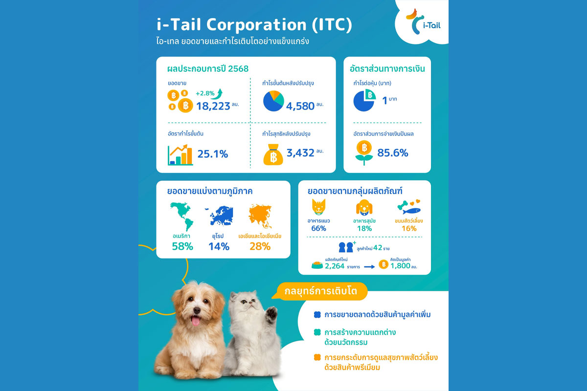 บริษัท ไอ-เทล คอร์ปอเรชั่น จำกัด (มหาชน) (ITC) ผู้นำระดับโลกในอุตสาหกรรมอาหารสัตว์เลี้ยง รายงานผลประกอบการปี 2568 เติบโตแข็งแกร่ง โดยยอดขายในสกุลดอลลาร์สหรัฐเพิ่มขึ้น 9.2% เมื่อเทียบกับปีก่อน อยู่ที่ 554 ล้านดอลลาร์สหรัฐ ยอดขายในสกุลเงินบาทเติบโต 2.8% เมื่อเทียบกับปีก่อน อยู่ที่ 18,223 ล้านบาท กำไรสุทธิหลังปรับปรุง (ไม่รวม Transformation Costs) อยู่ที่ 3,432 ล้านบาท สะท้อนการดำเนินงานที่มีวินัยและความต้องการที่เติบโตต่อเนื่องในทุกตลาดหลัก แม้เผชิญกับสภาวะเศรษฐกิจที่ท้าทาย คณะกรรมการบริษัทอนุมัติจ่ายเงินปันผลทั้งปี 0.85 บาทต่อหุ้น คิดเป็นอัตราการจ่ายเงินปันผลที่ 85.6%