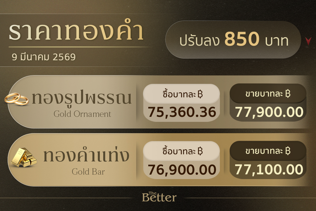 สมาคมค้าทองคำ เผย ราคาทองวันนี้ 9 มี.ค. เปิดตลาดร่วง 850 บาท ทองแท่ง 77,100 รูปพรรณ 77,900 บาท
