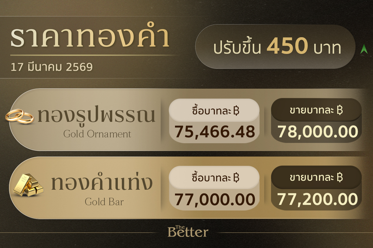 สมาคมค้าทองคำ เผย ราคาทองวันนี้ 17 มี.ค. 69 เปิดตลาดปรับขึ้น 450 บาท ทองแท่ง 77,200 รูปพรรณ 78,000 บาท