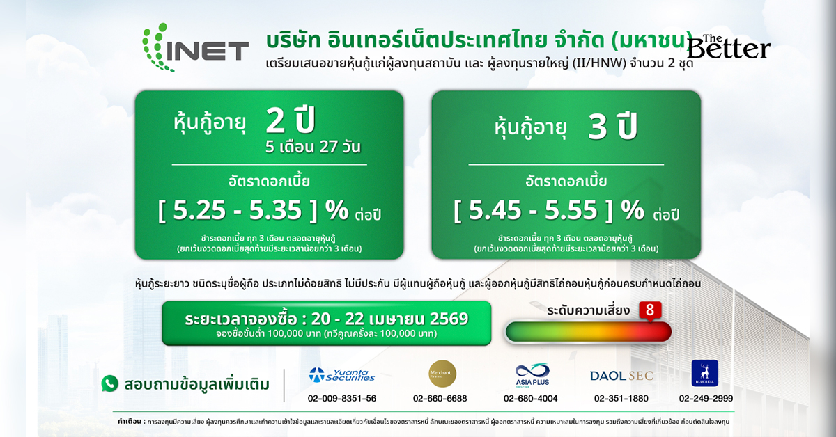 บมจ.อินเทอร์เน็ตประเทศไทย หรือ INET เดินหน้ายุทธศาสตร์ปี 2569 ตอกย้ำบทบาท Sovereign Provider ของประเทศไทย โดยมี คุณมรกต กุลธรรมโยธิน กรรมการผู้จัดการ INET เป็นแม่ทัพสำคัญในการผลักดันยุทธศาสตร์ดังกล่าว เร่งเตรียมความพร้อมด้านเงินทุนในโครงสร้างพื้นฐานสำคัญอย่าง Data Center แห่งที่ 4 (INET-IDC4) ผ่านการเสนอขายหุ้นกู้ครั้งที่ 2/2569 จำนวน 2 ชุด แก่นักลงทุนรายใหญ่ และนักลงทุนสถาบัน โดยหุ้นกู้ชุดที่ 1 รุ่น INET28OA อายุ 2 ปี 5 เดือน 27 วัน ครบกำหนดไถ่ถอนปี 2571 อัตราดอกเบี้ยคงที่ [5.25-5.35] % ต่อปี จ่ายดอกเบี้ยทุก 3 เดือน และหุ้นกู้ชุดที่ 2 รุ่น INET294A อายุ 3 ปี ครบกำหนดไถ่ถอนปี 2572 อัตราดอกเบี้ยคงที่ [5.45-5.55] % ต่อปี จ่ายดอกเบี้ยทุก 3 เดือน ราคาเสนอขายหน่วยละ 1,000 บาท จองซื้อขั้นต่ำ 100,000 บาท และทวีคูณครั้งละ 100,000 บาท
