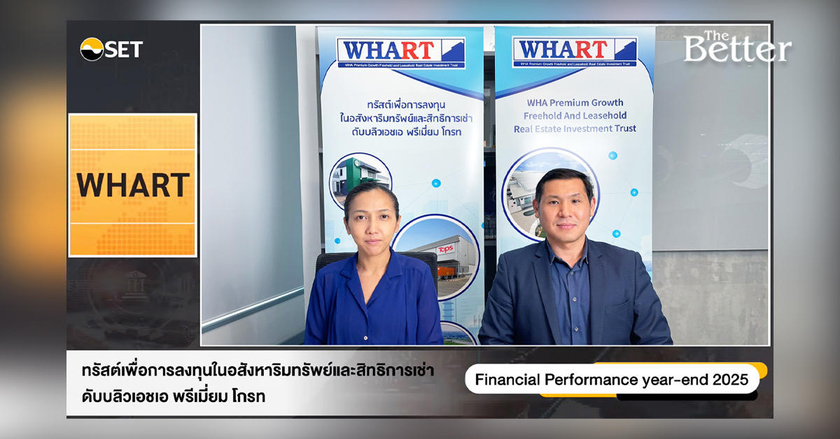 นายศุภศิษย์ สิทธเศรษฐ์ ประธานเจ้าหน้าที่บริหาร ในฐานะผู้จัดการกองทรัสต์ และนางสาว อธิกา มหาสุวรรณ์ ผู้จัดการฝ่ายพัฒนาธุรกิจ และนักลงทุนสัมพันธ์ บริษัท ดับบลิวเอชเอเรียล เอสเตท แมเนจเม้นท์ จำกัด ของทรัสต์เพื่อการลงทุนในอสังหาริมทรัพย์และสิทธิการเช่าดับบลิวเอชเอ พรีเมี่ยม โกรท (กองทรัสต์ WHART) กองทรัสต์อุตสาหกรรมชั้นนำในกลุ่ม WHA Group เปิดเผยผลประกอบการประจำปี 2568เติบโตแข็งแกร่งอย่างต่อเนื่อง โดยมีกำไรสุทธิจากการลงทุนแตะ 2,645.15 ล้านบาท พร้อมประกาศจ่ายเงินปันผลไตรมาส 4/2568 ตอกย้ำการเป็นกองทรัสต์ที่ให้ผลตอบแทนสม่ำเสมอด้วยDPU รวมทั้งปีที่ 0.7735 บาทต่อหน่วย