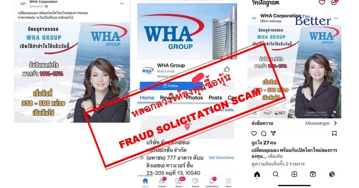 WHA Group พบพฤติกรรมหลอกหลวง! เตือนนักลงทุน ระวังกลุ่มมิจฉาชีพแอบอ้างใช้รูปผู้บริหาร โลโก้ Facebook และ Instagram ของบริษัทฯ ในการโฆษณาชวนเชื่อบนแพลตฟอร์มโซเชียลมีเดีย เพื่อชักชวนลงทุนการเทรดหุ้น