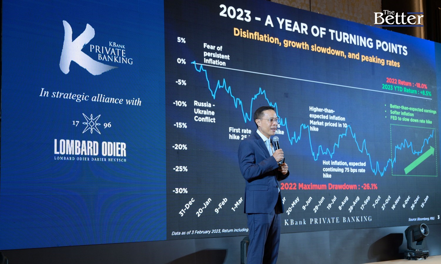 นายจิรวัฒน์ สุภรณ์ไพบูลย์ Executive Chairman, Private Banking Group ธนาคารกสิกรไทย เปิดเผยว่า ตลาดทุนในปี 2565 พบกับความท้าทายรอบด้าน โดยสินทรัพย์แทบทุกประเภทต้องเผชิญกับภาวะขาดทุน ในขณะที่ปัจจัยทางเศรษฐกิจที่ส่งผลต่อภาคการลงทุนในช่วงต้นปี 2566 เริ่มส่งสัญญาณเป็นบวก ทั้งภาวะเงินเฟ้อที่มีแนวโน้มปรับตัวลดลงโดยเฉพาะราคาสินค้า แต่ราคาบริการยังคงทรงตัวในระดับสูง จากตลาดแรงงานที่ยังแข็งแกร่ง การขึ้นอัตราดอกเบี้ยนโยบายของธนาคารกลางทั่วโลก โดยเฉพาะสหรัฐอเมริกา เริ่มเข้าใกล้จุดสูงสุด และจะคงดอกเบี้ยในระดับสูงจนถึงช่วงปลายปีนี้ คาดว่าเศรษฐกิจของประเทศพัฒนาแล้วจะเข้าสู่ภาวะชะลอตัว (Slow Down) แต่เศรษฐกิจของประเทศเกิดใหม่มีแนวโน้มแข็งแกร่งกว่า หนุนจากการเปิดประเทศของจีน