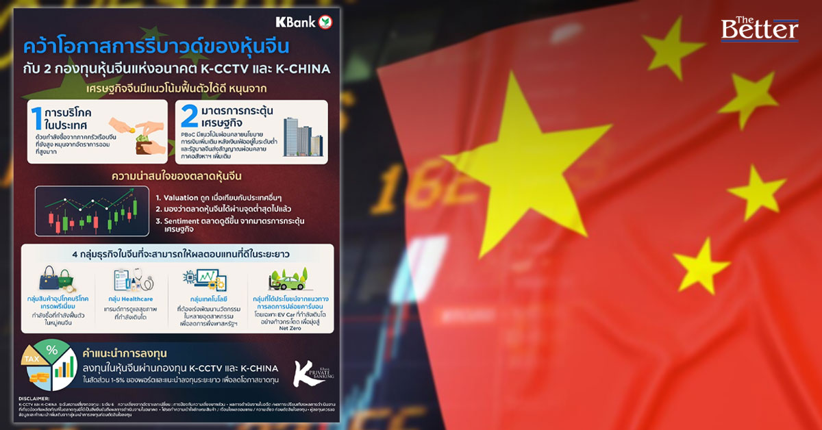 KBank Private Banking (เคแบงก์ ไพรเวทแบงกิ้ง) มองเศรษฐกิจจีนยังคงดูดี จากแรงหนุนจากการบริโภคในประเทศที่คาดว่าจะฟื้นตัวต่อเนื่อง ด้วยอัตราการออมของภาคครัวเรือนที่สูงมาก และมาตรการกระตุ้นเศรษฐกิจจากธนาคารกลางจีน (PBoC) ที่มีแนวโน้มผ่อนคลายนโยบายการเงินเพิ่มเติม พร้อมโอกาสการเติบโตของธุรกิจจีนในหลากหลายอุตสาหกรรม เนื่องจากรัฐบาลจีนต้องการตัวช่วยใหม่ที่ขับเคลื่อนเศรษฐกิจจีนแทนการส่งออก และภาคอสังหาฯ ชี้ 4 กลุ่มธุรกิจที่น่าจับตา คือ สินค้าอุปโภคเกรดพรีเมี่ยม เฮลธ์แคร์ เทคโนโลยี และธุรกิจที่ลดการปล่อยคาร์บอน จะสามารถให้ผลตอบแทนที่ดีในระยะยาว แนะนำให้ลงทุนผ่านกองทุนหุ้นระยะยาว ควบคู่กับสินทรัพย์อื่น โดยเฉพาะสินทรัพย์ปลอดภัย เพื่อกระจายความเสี่ยง และลดโอกาสขาดทุน
