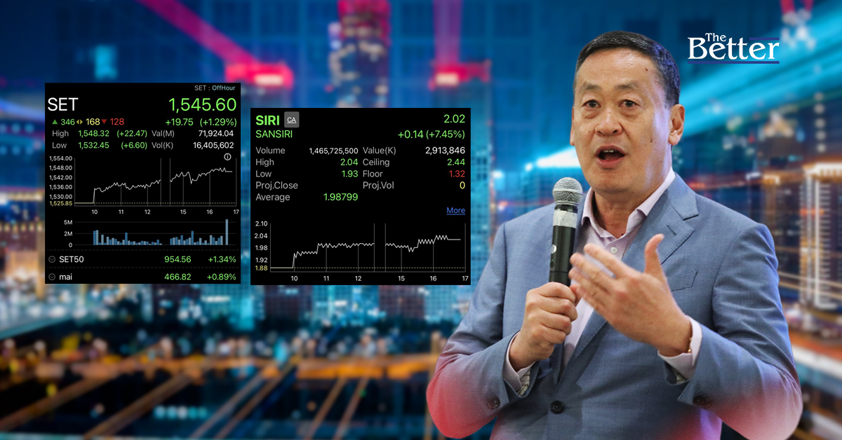 วันนี้ดัชนีตลาดหุ้นไทยปิดที่ 1,545.60 จุด เพิ่มขึ้น 19.75 จุด คิดเป็น 1.29 % ขณะที่หุ้น บริษัท แสนสิริ จำกัด (มหาชน) หรือ SIRI ปิดที่ 2.02 บาท เพิ่มขึ้น 0.14 บาท คิดเป็น +7.45 % รับปัจจัยบวกจากการเลือกตั้งนายกรัฐมนตรีคนที่ 30 ของประเทศไทย โดย "นายเศรษฐา ทวีสิน" ได้รับตำแหน่งดังกล่าว ซึ่งขณะนี้ได้รับคะแนนโหวตเกิน 375 แล้ว
