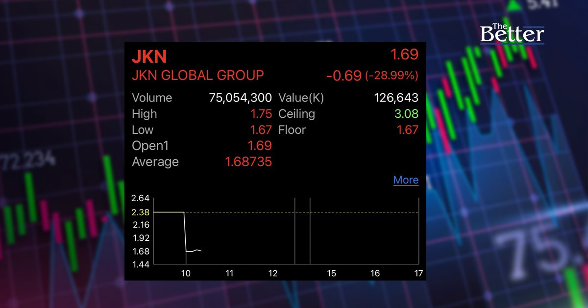 ผู้สื่อข่าวรายงานความเคลื่อนไหวราคาหุ้น บริษัท เจเคเอ็น โกลบอล กรุ๊ป จํากัด (มหาชน) หรือหุ้น JKN ณ เวลา 10.30 น. โดยราคาหุ้นอยู่ที่ 1.69 บาท ลดลง -0.69 บาท หรือคิดเป็น -28.99% หลังบริษัทฯได้แจ้งข่าวต่อตลาดหลักทรัพย์แห่งประเทศไทยว่า