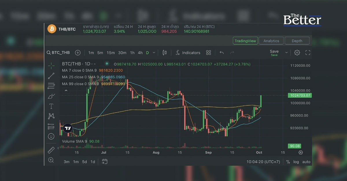 ราคา Bitcoin (BTC) ปรับขึ้นเกือบ 4% ทะลุ 1,000,000 บาท ทำระดับสูงสุดที่ 1,025,000 บาท บนกระดานเทรดBitkub Exchange ในวันที่ 2 ตุลาคม พ.ศ. 2566 เวลาประมาณ 10.00 น. ท่ามกลางตลาดคริปโตที่กลับมามีมุมมองที่ดีอีกครั้งจากความคาดหวังว่าจะเริ่มเห็นกองทุน Bitcoin ETF เปิดให้เทรดเร็ว ๆ นี้