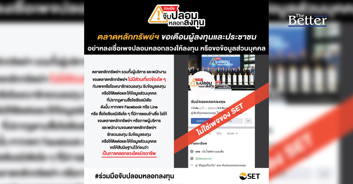 “ตลาดหลักทรัพย์ฯ ขอเตือนอย่าหลงเชื่อ และขอความร่วมมือไม่ส่งหรือแชร์ต่อ เพจปลอมเกี่ยวกับโครงการ ‘ร่วมมือจับปลอมหลอกลงทุน’ ”