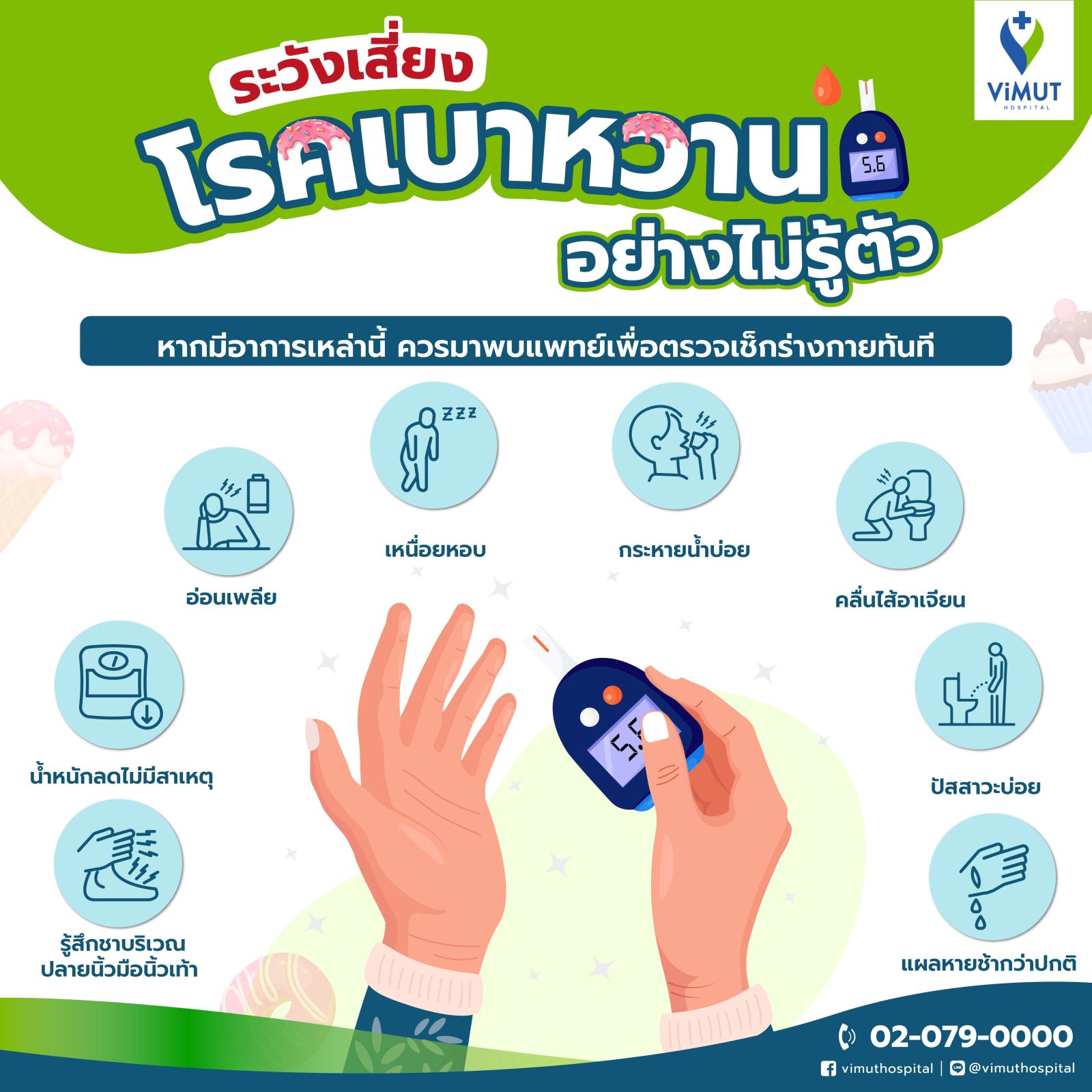 ผู้ที่สนใจต้องการปรึกษาแพทย์โรงพยาบาลวิมุต สามารถติดต่อได้ที่ ชั้น 3 ศูนย์เบาหวาน ต่อมไร้ท่อ และควบคุมน้ำหนัก หรือโทรนัดหมาย 02-079-0070 เวลา 07.00-19.00 น. หรือใช้บริการ Telemedicine ปรึกษาแพทย์ออนไลน์ผ่าน ViMUT App คลิก https://bit.ly/372qexX