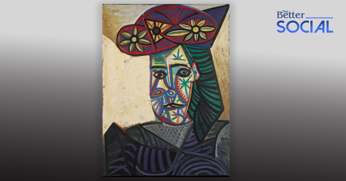 ภาพนี้มีชื่อว่า Bust of a Woman with a Flowered Hat (Dora Maar) ถูกวาดขึ้นโดย Picasso ในปี 1943 เชื่อกันว่า ผู้ที่อยู่ในภาพนี้ คือ ดอร่า มาร์ (Dora Maar) ช่างภาพและจิตรกรชาวฝรั่งเศส และเป็นคนรักของเขานั่นเอง โดยภาพนี้เสร็จสิ้นสมบูรณ์เมื่อทั้งคู่ใกล้จะจบรักที่ยาวนานกว่า 9 ปี ด้วยปัญหาความสัมพันธ์ที่ทำให้ดาร่าเสียใจไม่น้อย