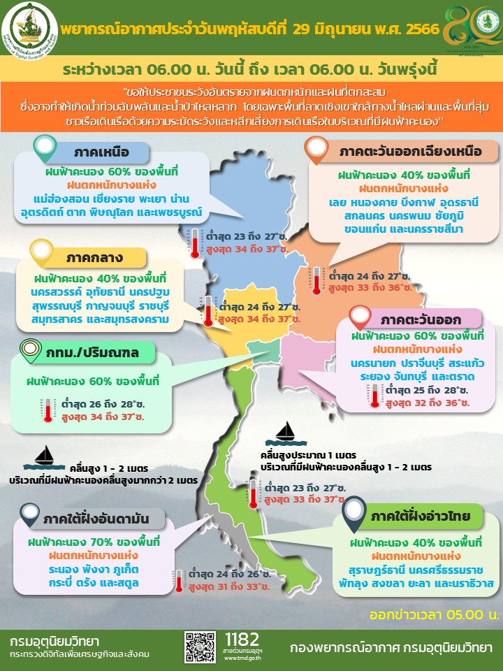 กรมอุตุนิยมวิทยา รายงาน ลักษณะอากาศทั่วไป ประจำวันที่ 29 มิถุนายน 2566 พยากรณ์อากาศ 24 ชั่วโมงข้างหน้า ร่องมรสุมพาดผ่านตอนบนของภาคเหนือและประเทศลาว เข้าสู่หย่อมความกดอากาศต่ำบริเวณชายฝั่งประเทศเวียดนามตอนกลาง ประกอบกับมรสุมตะวันตกเฉียงใต้ที่พัดปกคลุมทะเลอันดามัน ภาคใต้ และอ่าวไทยมีกำลังปานกลาง ลักษณะเช่นนี้ทำให้ประเทศไทยยังคงมีฝนฟ้าคะนองกับมีฝนตกหนักบางแห่งในภาคเหนือตอนบน ภาคตะวันออก และภาคใต้