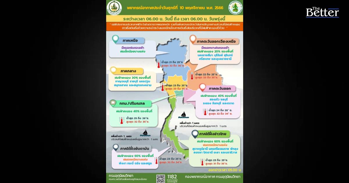 อนึ่ง ในช่วงวันที่ 11 – 14 พ.ย. 66 ภาคใต้จะมีฝนเพิ่มขึ้น และมีฝนตกหนักบางแห่ง เนื่องจากร่องมรสุมพาดผ่านภาคใต้ตอนล่าง ประกอบกับมีหย่อมความกดอากาศต่ำปกคลุมบริเวณชายฝั่งประเทศมาเลเซีย ขอให้ประชาชนบริเวณภาคใต้ระวังอันตรายจากฝนตกหนักและฝนที่ตกสะสม ซึ่งอาจทำให้เกิดน้ำท่วมฉับพลันและน้ำป่าไหลหลาก โดยเฉพาะพื้นที่ลาดเชิงเขาใกล้ทางน้ำไหลผ่านและพื้นที่ลุ่มไว้ด้วย