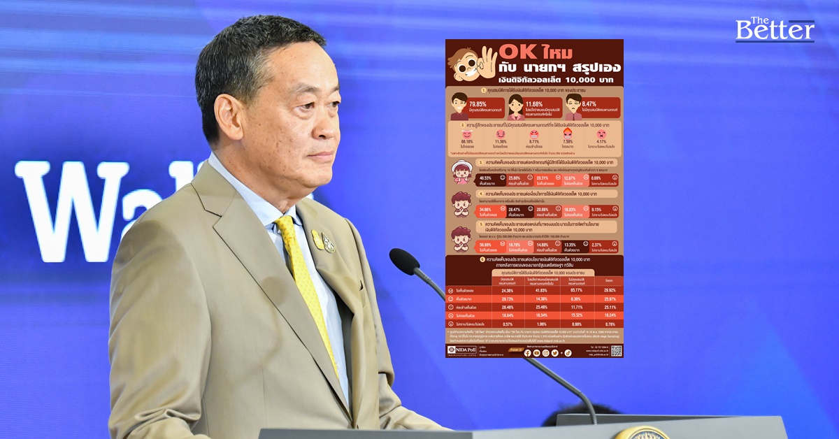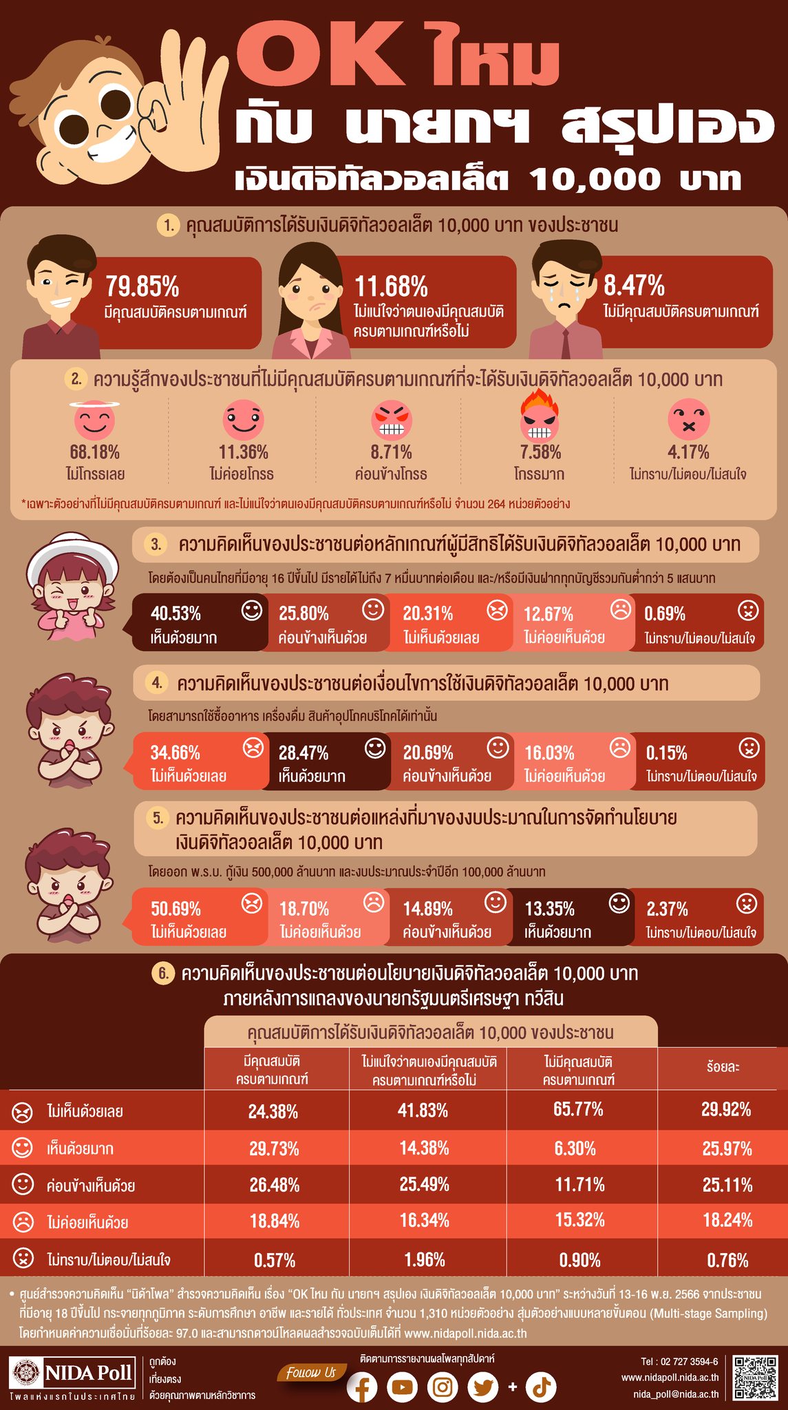 ศูนย์สำรวจความคิดเห็น “นิด้าโพล” สถาบันบัณฑิตพัฒนบริหารศาสตร์ (นิด้า) เปิดเผยผลสำรวจของประชาชน เรื่อง “OK ไหม กับ นายกฯ สรุปเอง เงินดิจิทัลวอลเล็ต 10,000 บาท” ทำการสำรวจระหว่างวันที่ 13-16 พฤศจิกายน 2566 จากประชาชนที่มีอายุ 18 ปีขึ้นไป กระจายทุกภูมิภาค ระดับการศึกษา อาชีพ และรายได้ ทั่วประเทศ รวมทั้งสิ้น จำนวน 1,310 หน่วยตัวอย่าง เกี่ยวกับบทสรุปของนโยบายเงินดิจิทัลวอลเล็ต 10,000 บาท ภายหลังการแถลงของนายกรัฐมนตรีเศรษฐา ทวีสิน การสำรวจอาศัยการสุ่มตัวอย่างโดยใช้ความน่าจะเป็นจากบัญชีรายชื่อฐานข้อมูลตัวอย่างหลัก (Master Sample) ของ “นิด้าโพล” สุ่มตัวอย่างแบบหลายขั้นตอน (Multi-stage Sampling) เก็บข้อมูลด้วยวิธีการสัมภาษณ์ทางโทรศัพท์ โดยกำหนดค่าความเชื่อมั่น ร้อยละ 97.0