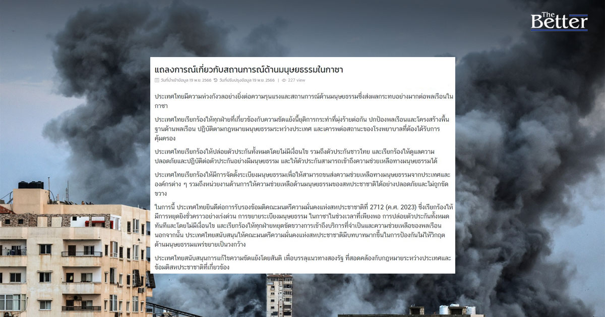 กระทรวงการต่างประเทศ ได้ออกแถลงการณ์เกี่ยวกับสถานการณ์ด้านมนุษยธรรมในกาซาโดยระบุว่า ประเทศไทยมีความห่วงกังวลอย่างยิ่งต่อความรุนแรงและสถานการณ์ด้านมนุษยธรรมซึ่งส่งผลกระทบอย่างมากต่อพลเรือนในกาซา ประเทศไทยเรียกร้องให้ทุกฝ่ายที่เกี่ยวข้องกับความขัดแย้งนี้ยุติการกระทำที่มุ่งร้ายต่อกัน ปกป้องพลเรือนและโครงสร้างพื้นฐานด้านพลเรือน ปฏิบัติตามกฎหมายมนุษยธรรมระหว่างประเทศ และเคารพต่อสถานะของโรงพยาบาลที่ต้องได้รับการคุ้มครอง ประเทศไทยเรียกร้องให้ปล่อยตัวประกันทั้งหมดโดยไม่มีเงื่อนไข รวมถึงตัวประกันชาวไทย และเรียกร้องให้ดูแลความปลอดภัยและปฏิบัติต่อตัวประกันอย่างมีมนุษยธรรม และให้ตัวประกันสามารถเข้าถึงความช่วยเหลือทางมนุษยธรรมได้ ประเทศไทยเรียกร้องให้มีการจัดตั้งระเบียงมนุษยธรรมเพื่อให้สามารถขนส่งความช่วยเหลือทางมนุษยธรรมจากประเทศและองค์กรต่าง ๆ รวมถึงหน่วยงานด้านการให้ความช่วยเหลือด้านมนุษยธรรมของสหประชาชาติได้อย่างปลอดภัยและไม่ถูกขัดขวาง