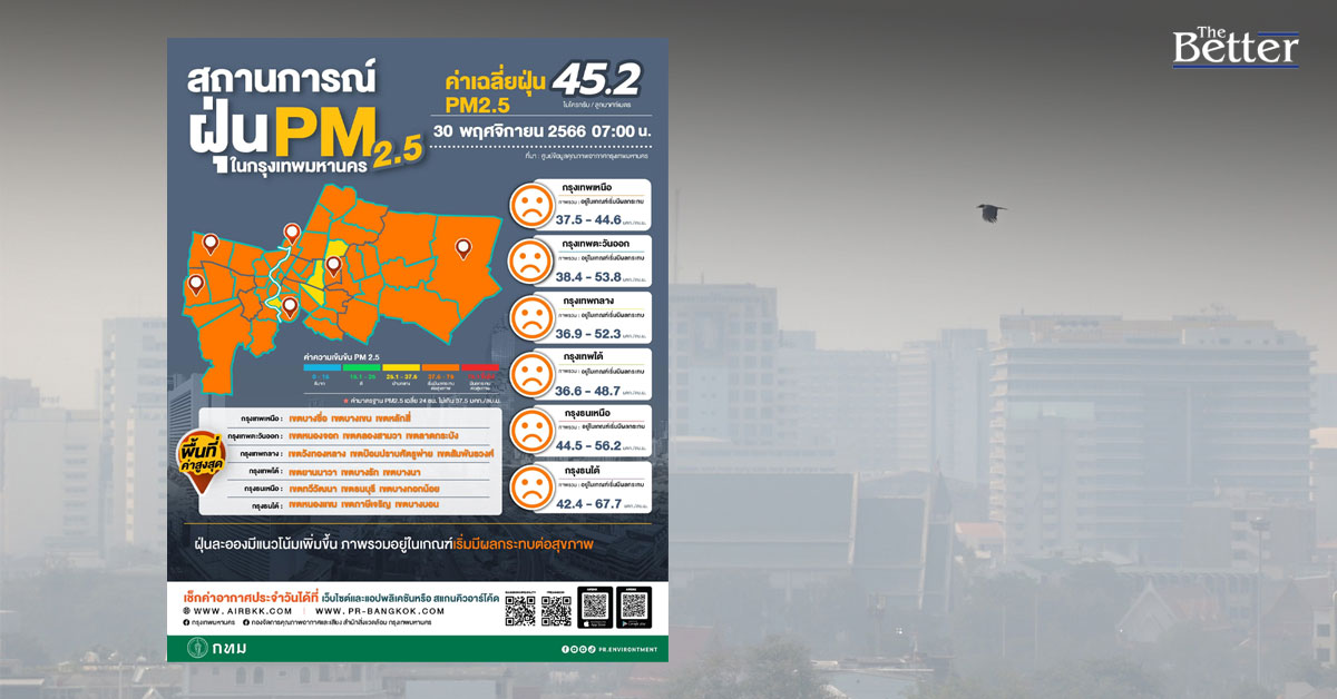ศูนย์ข้อมูลคุณภาพอากาศกรุงเทพมหานครขอสรุปผลการตรวจวัด PM2.5 วันที่ 30 พฤศจิกายน 2566 เวลา 05.00-07.00 น. (3 ชั่วโมงล่าสุด) ตรวจวัดได้ 33.3-67.1 มคก./ลบ.ม.ค่าเฉลี่ยของกรุงเทพมหานคร 45.2 มคก./ลบ.ม.ค่า PM2.5 มีแนวโน้มเพิ่มขึ้น เกินมาตรฐานอยู่ในระดับสีส้ม เริ่มมีผลกระทบต่อสุขภาพ จำนวน 59 พื้นที่