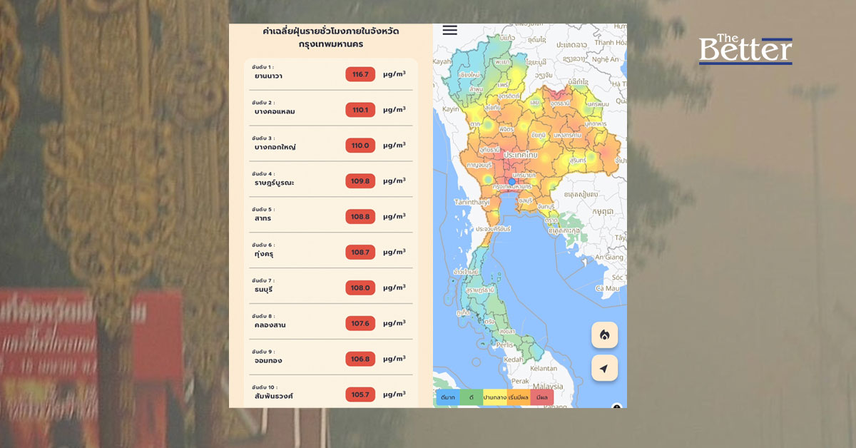 ส่วนกรุงเทพมหานคร พบค่าฝุ่นเกินมาตรฐานระดับสีแดงทุกเขต อันดับสูงสุดของ กทม. อยู่ที่ ยานนาวา บางคอแหลม บางกอกใหญ่ ราษฎร์บูรณะ สาทร เป็นต้น