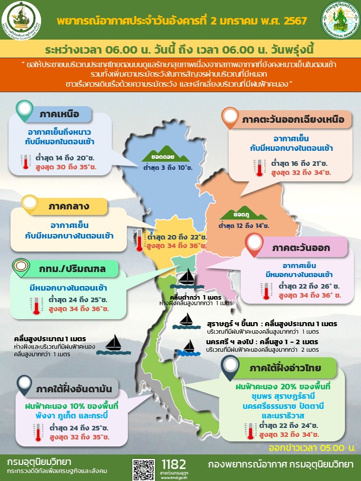 กรมอุตุนิยมวิทยา รายงาน ลักษณะอากาศทั่วไป ประจำวันที่ 02 มกราคม 2567 พยากรณ์อากาศ 24 ชั่วโมงข้างหน้า บริเวณความกดอากาศสูงหรือมวลอากาศเย็นกำลังปานกลางปกคลุมประเทศไทยตอนบน ในขณะที่ลมฝ่ายตะวันตกในระดับบนพัดปกคลุมภาคเหนือ ลักษณะเช่นนี้ทำให้ภาคเหนือยังคงมีอากาศเย็นถึงหนาวกับมีหมอกในตอนเช้า ส่วนภาคตะวันออกเฉียงเหนือ ภาคกลาง และภาคตะวันออกมีอากาศเย็นกับมีหมอกบางในตอนเช้า สำหรับบริเวณยอดดอยของภาคเหนือมีอากาศหนาวถึงหนาวจัดกับมีน้ำค้างแข็งบางแห่ง อุณหภูมิต่ำสุด 3-10 องศาเซลเซียส ส่วนยอดภูของภาคตะวันออกเฉียงเหนือมีอากาศหนาว อุณหภูมิต่ำสุด 12-14 องศาเซลเซียส ขอให้ประชาชนบริเวณประเทศไทยตอนบนดูแลรักษาสุขภาพเนื่องจากสภาพอากาศที่ยังคงหนาวเย็นในตอนเช้า รวมทั้งเพิ่มระมัดระวังในการสัญจรผ่านบริเวณที่มีหมอกในระยะนี้ไว้ด้วย