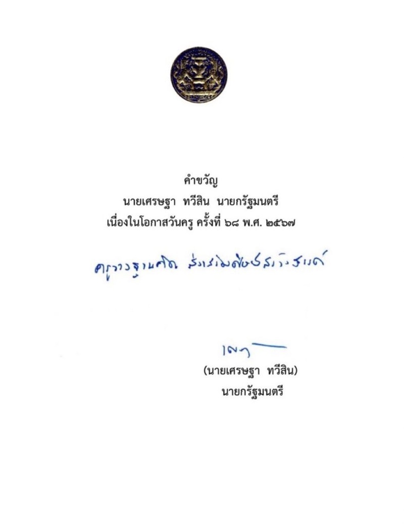 นายเศรษฐา ทวีสิน นายกรัฐมนตรีและรัฐมนตรีว่าการกระทรวงการคลัง โพสต์ข้อความผ่าน X มอบคำขวัญวันครู 2567 พร้อมข้อความระบุว่า “ครู” คือผู้นำความรู้ทั้งจากทั้งในตำรา และจากประสบการณ์ที่สั่งสมมาถ่ายทอดให้กับศิษย์ งานของครูในโลกยุคใหม่ที่มีการเปลี่ยนแปลงอย่างรวดเร็วนี้ จึงไม่ใช่แค่การสอนหนังสือให้ความรู้ตามตำรา แต่ครูยังต้องใส่ใจสอนวิธีคิด และวิธีจัดการกับข้อมูลที่มีอยู่อย่างหลากหลาย เพื่อให้ศิษย์สามารถจัดระเบียบความคิดได้ รวมถึงเติบโตขึ้นเป็นคนที่มีความสามารถในการแสวงหาความรู้ได้ด้วยตัวเองอย่างมีคุณภาพ