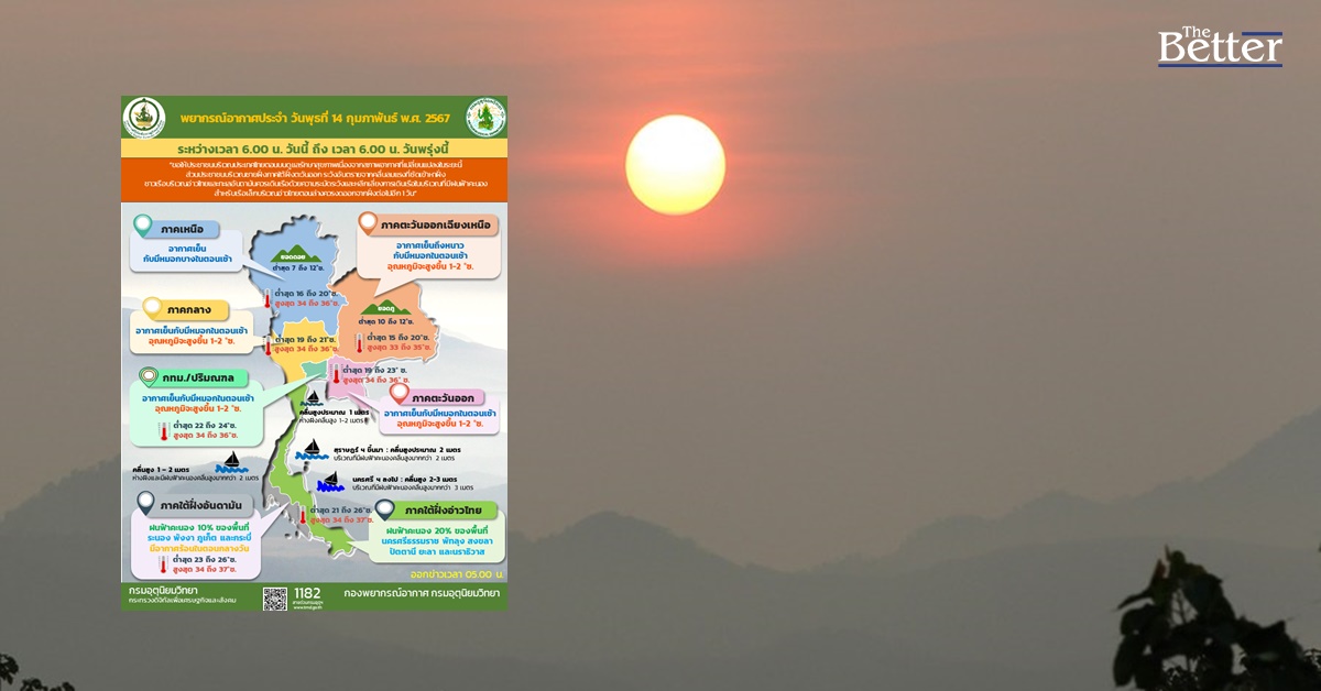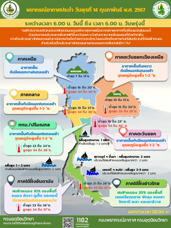 กรมอุตุนิยมวิทยา รายงาน ลักษณะอากาศทั่วไป ประจำวันที่ 14 กุมภาพันธ์ 2567 พยากรณ์อากาศ 24 ชั่วโมงข้างหน้า บริเวณความกดอากาศสูงหรือมวลอากาศเย็นกำลังค่อนข้างแรงที่ปกคลุมประเทศไทยตอนบนมีกำลังอ่อนลง ทำให้ประเทศไทยตอนบนมีอุณหภูมิสูงขึ้นกับมีหมอกในตอนเช้า แต่ยังคงมีอากาศเย็นถึงหนาวบริเวณภาคตะวันออกเฉียงเหนือ ส่วนภาคเหนือ ภาคกลาง รวมทั้งกรุงเทพมหานครและปริมณฑล และภาคตะวันออกมีอากาศเย็นในตอนเช้า ขอให้ประชาชนในบริเวณดังกล่าวดูแลรักษาสุขภาพเนื่องจากสภาพอากาศที่เปลี่ยนแปลงในระยะนี้