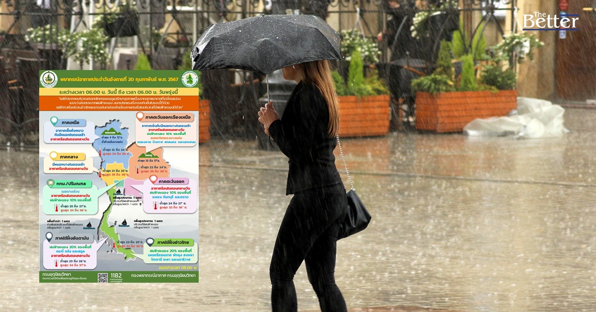 กรมอุตุนิยมวิทยา รายงาน ลักษณะอากาศทั่วไป ประจำวันที่ 20 กุมภาพันธ์ 2567 พยากรณ์อากาศ 24 ชั่วโมงข้างหน้า ลมใต้และลมตะวันออกเฉียงใต้พัดปกคลุมภาคตะวันออกเฉียงเหนือตอนล่าง ภาคกลางตอนล่าง และภาคตะวันออก ลักษณะเช่นนี้ทำให้บริเวณดังกล่าวมีฝนฟ้าคะนองบางแห่ง ขอให้ประชาชนบริเวณประเทศไทยตอนบนดูแลรักษาสุขภาพเนื่องจากสภาพอากาศที่เปลี่ยนแปลง และระวังอันตรายจากฝนฟ้าคะนอง ลมกระโชกแรงที่อาจจะเกิดขึ้นในระยะนี้ไว้ด้วย