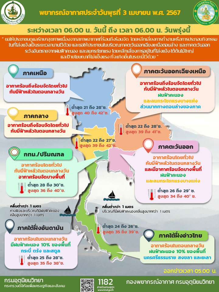 กรมอุตุนิยิมวิทยา รายงาน ลักษณะอากาศทั่วไป ประจำวันที่ 03 เมษายน 2567 พยากรณ์อากาศ 24 ชั่วโมงข้างหน้า ความกดอากาศต่ำเนื่องจากความร้อนปกคลุมประเทศไทยตอนบน ลักษณะเช่นนี้ทำให้ประเทศไทยมีอากาศร้อนถึงร้อนจัดโดยทั่วไปกับมีฟ้าหลัวในตอนกลางวัน ขอให้ประชาชนดูแลรักษาสุขภาพเนื่องจากสภาพอากาศที่ร้อนถึงร้อนจัด โดยหลีกเลี่ยงการทำงานหรือการประกอบกิจกรรมในที่โล่งแจ้งเป็นระยะเวลานานไว้ด้วย ในขณะที่ลมใต้และลมตะวันตกเฉียงใต้ยังคงพัดปกคลุมภาคตะวันออกเฉียงเหนือตอนล่าง และภาคตะวันออก ลักษณะเช่นนี้ทำให้บริเวณดังกล่าวมีฝนฟ้าคะนองกับลมกระโชกแรงบางแห่ง ขอให้ประชาชนในบริเวณดังกล่าวระวังอันตรายจากฝนฟ้าคะนอง และลมกระโชกแรง โดยหลีกเลี่ยงการอยู่ในที่โล่งแจ้ง ใต้ต้นไม้ใหญ่ และป้ายโฆษณาที่ไม่แข็งแรง ที่จะเกิดขึ้นในระยะนี้ไว้ด้วย